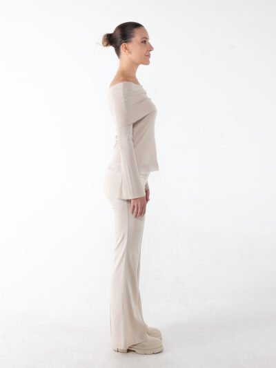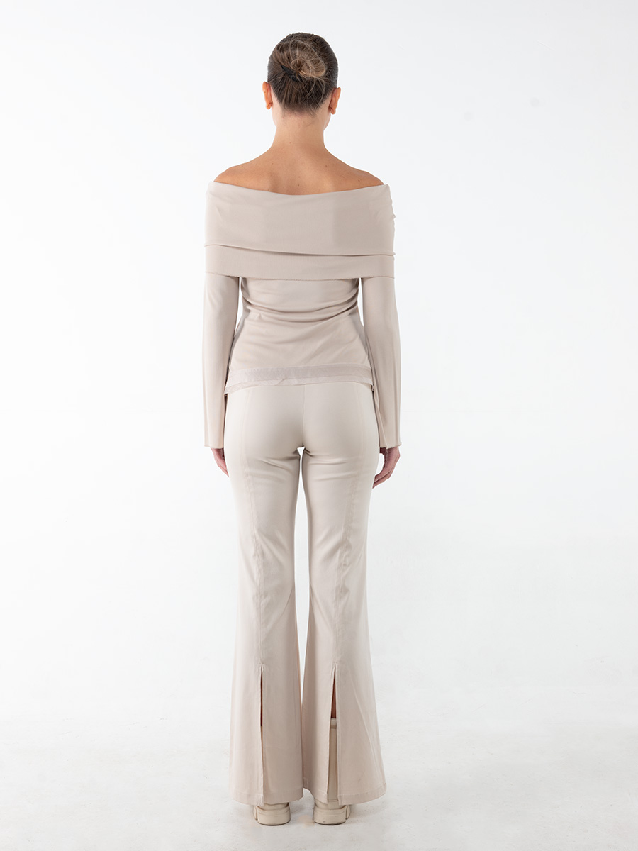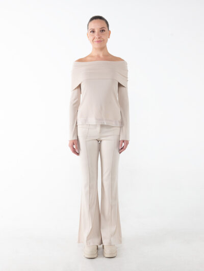 Έξωμη μπλούζα από απαλή ριμπ βισκόζη με λεπτομέρειες από διαφάνεια. Έχει άνετη εφαρμογή που αγκαλιάζει το σώμα ενώ το επάνω μέρος γυρίζει προς τα έξω