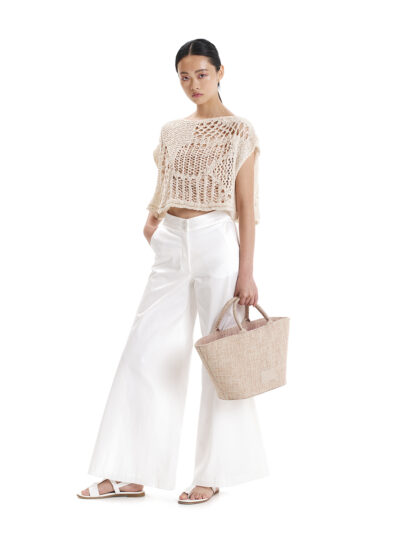 Αμάνικο τοπ από βαμβακερό νήμα με ιδιαίτερη υφή. Έχει άνετη εφαρμογή με ίσια λαιμόκοψη. Η περίτεχνη πλέξη του αντλεί την έμπνευσή της από τα στοιχεία της φύσης και της γης και αποδίδεται μοναδικά στο βαμβακερό νήμα. Ένα σχέδιο ιδανικό για την περίοδο των διακοπών που συνθέτει stylish resort σύνολα.