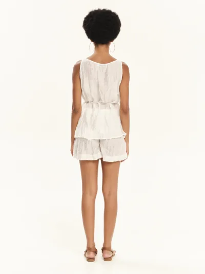 Αμάνικο τοπ με δέσιμο από διάφανο crinkle ύφασμα. Έχει άνετη εφαρμογή με ελαφριά “V” λαιμόκοψη ενώ καλύπτει απαλά τη σιλουέτα. Έχει δέσιμο στο πλάι για να τονίζει τη μέση ενώ η ιδιαίτερη υφή του υλικού σε συνδυασμό με την απαλή διαφάνειά του το καθιστά ιδανική επιλογή για cool, resort σύνολα.
