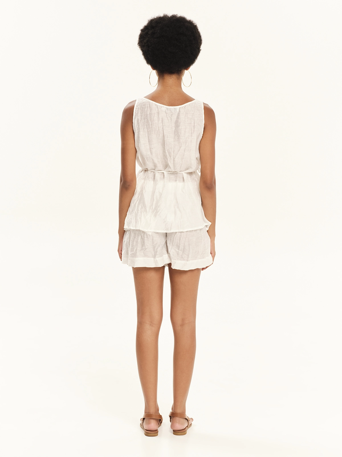 Αμάνικο τοπ με δέσιμο από διάφανο crinkle ύφασμα. Έχει άνετη εφαρμογή με ελαφριά “V” λαιμόκοψη ενώ καλύπτει απαλά τη σιλουέτα. Έχει δέσιμο στο πλάι για να τονίζει τη μέση ενώ η ιδιαίτερη υφή του υλικού σε συνδυασμό με την απαλή διαφάνειά του το καθιστά ιδανική επιλογή για cool, resort σύνολα.