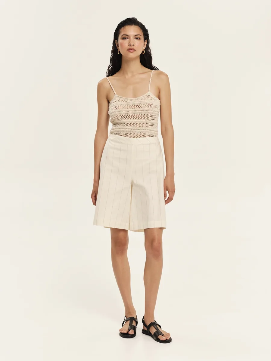 Βερμούδα σε ίσια γραμμή από σύμμικτο βαμβάκι με λινό, με λάστιχο πίσω στη μέση για άνετη και ευέλικτη εφαρμογή. Διαθέτει καθαρή, μίνιμαλ γραμμή που προσφέρει κομψό και διαχρονικό look. Ένα premium κομμάτι που συνδυάζει άνεση, σύγχρονο design και refined λεπτομέρεια, ιδανικό για daywear και resort εμφανίσεις.