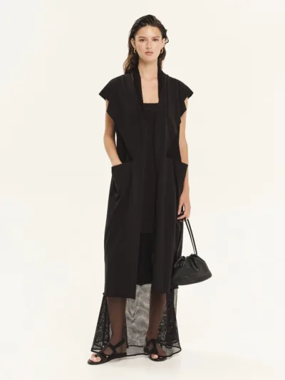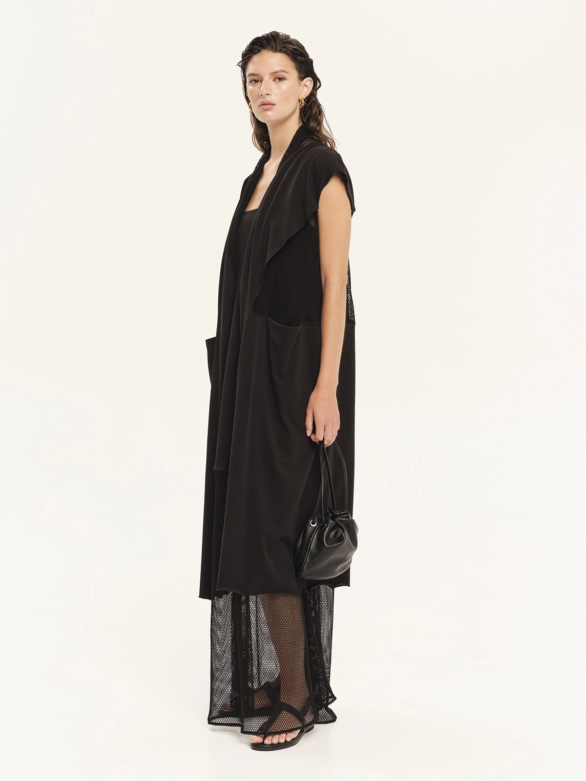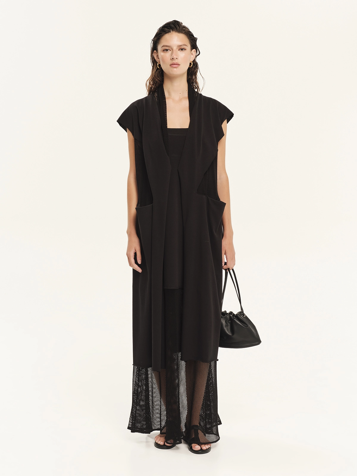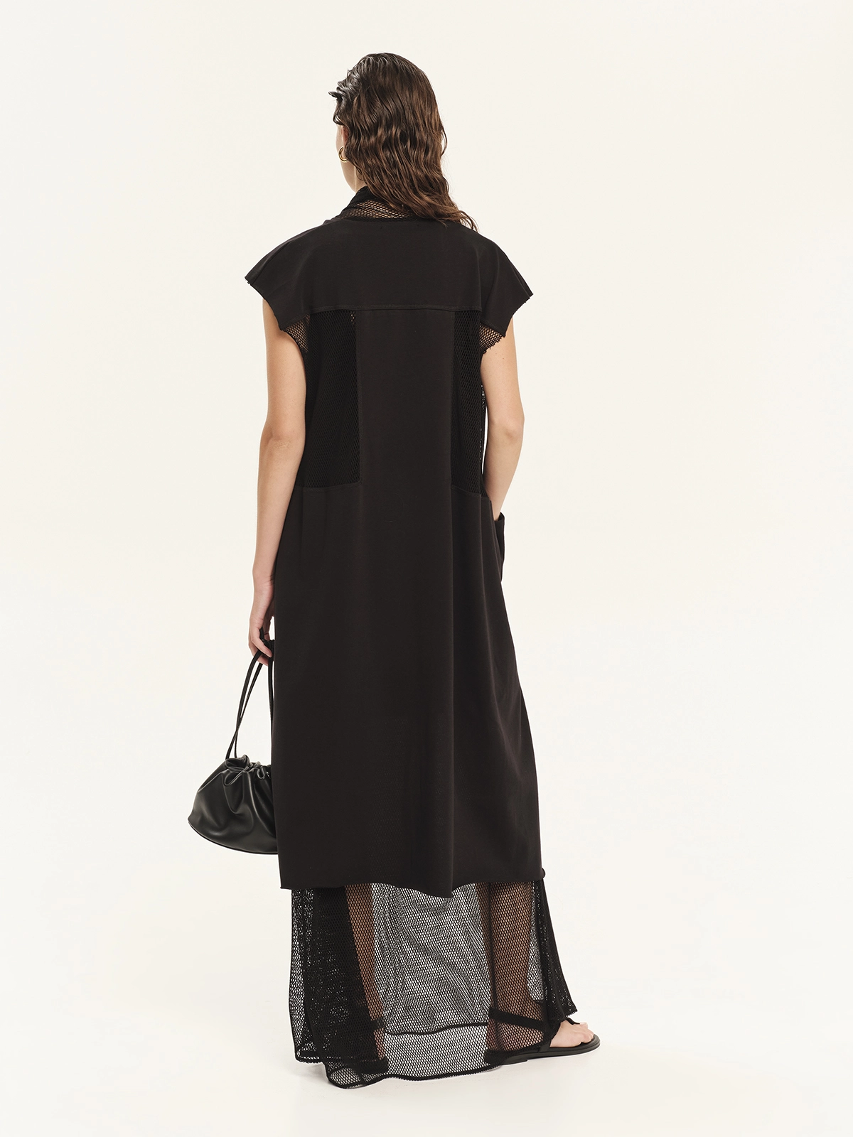 Μακριά αμάνικη ζακέτα από 100% βαμβακερό φούτερ σε συνδυασμό με δίχτυ. Διαθέτει γεωμετρικά κοψίματα και διαφάνειες στα πλαϊνά, προσφέροντας άνετη εφαρμογή και σύγχρονη αισθητική. Μια ανεπιτήδευτη και cool επιλογή, ιδανική για καλοκαιρινά layering looks.