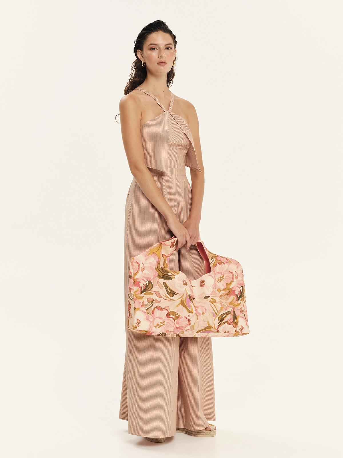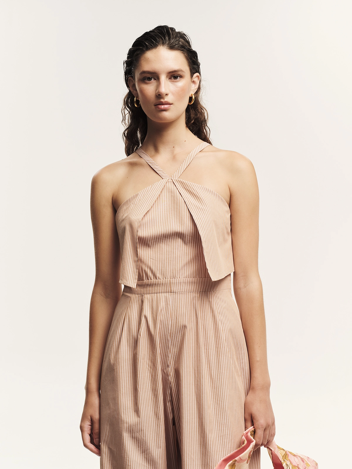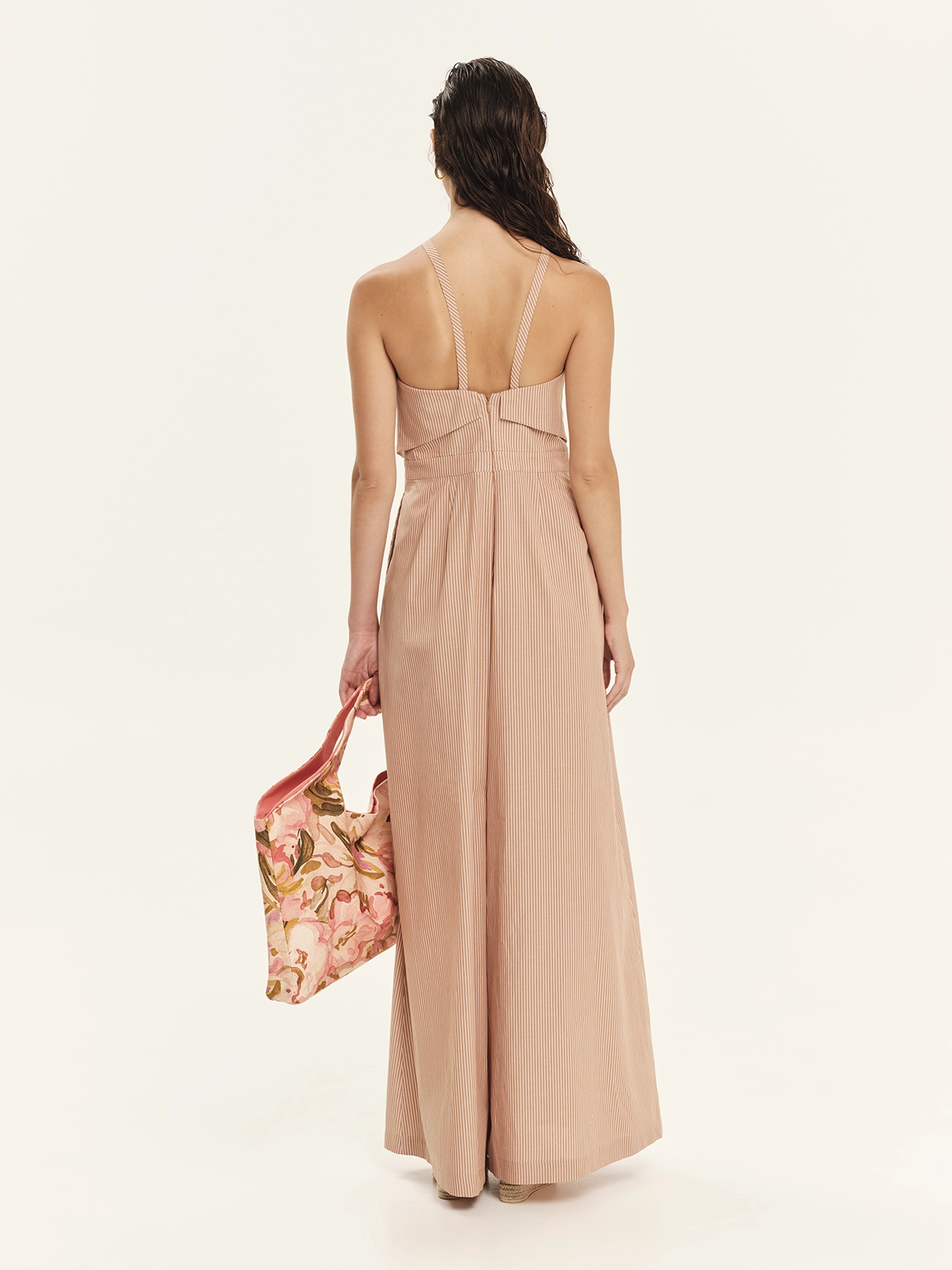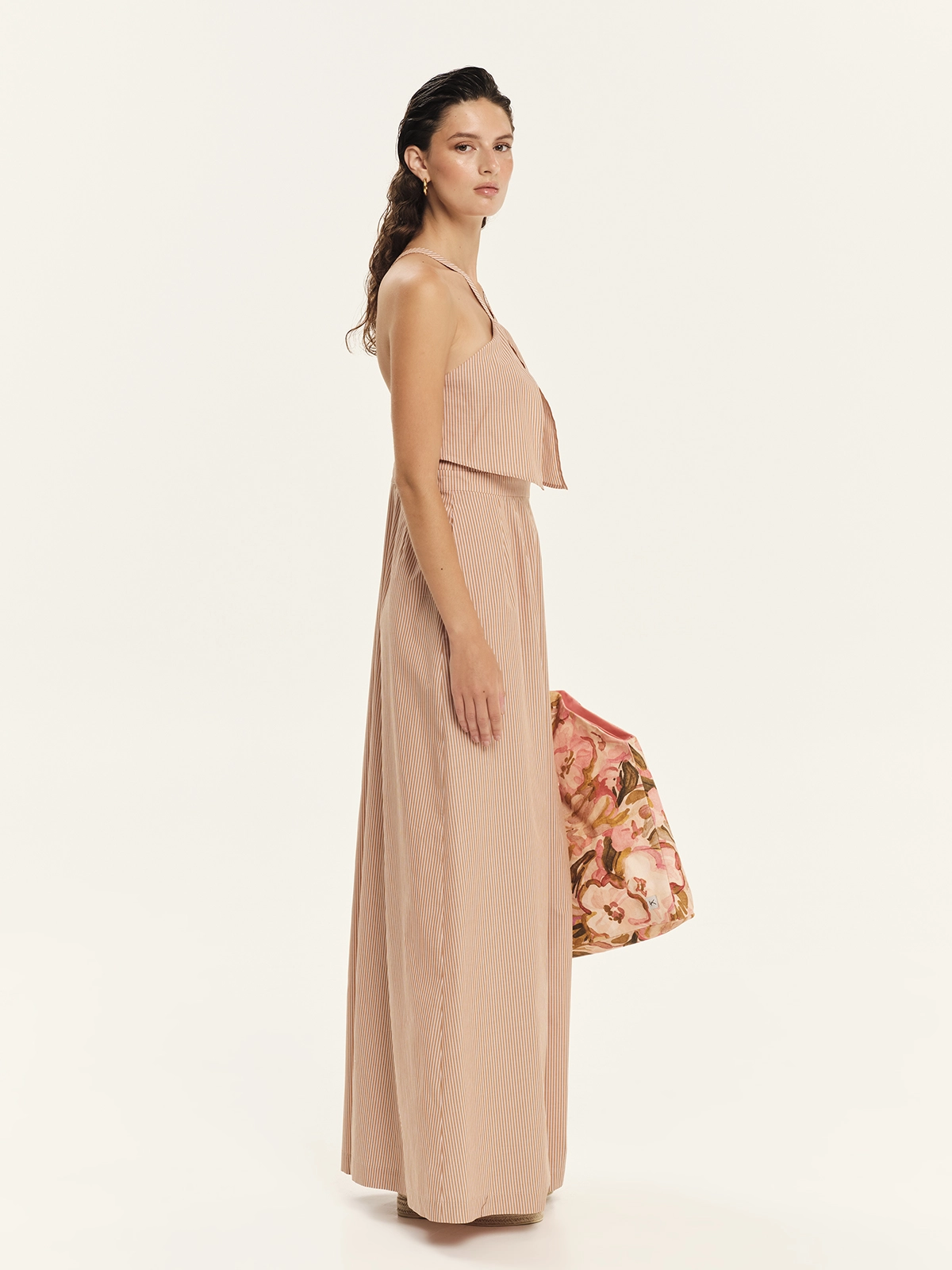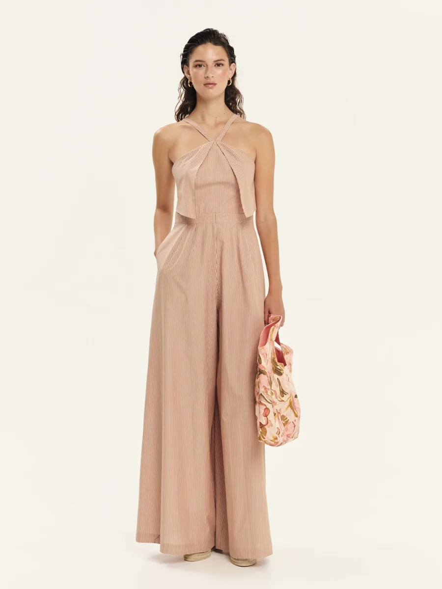 Ολόσωμη φόρμα από 100% βαμβακερή ριγέ ποπλίνα σε fun, καλοκαιρινές αποχρώσεις. Είναι στενή στο επάνω μέρος με ζωνάκι που τονίζει τη μέση και φαρδιά παντελόνα, δημιουργώντας μια κομψή, ισορροπημένη σιλουέτα. Διαθέτει λεπτές τιράντες σε παρτή γραμμή, τσέπες στο πλάι για πρακτικότητα και φερμουάρ στο πίσω μέρος για εύκολο κλείσιμο. Ένα premium jumpsuit εμπνευσμένο από το ναυτικό στιλ με το σχέδιο των πανελ μπροστά, που συνδυάζει άνεση, κομψότητα και σύγχρονη αισθητική, ιδανικό για day-to-evening εμφανίσεις και resort looks.