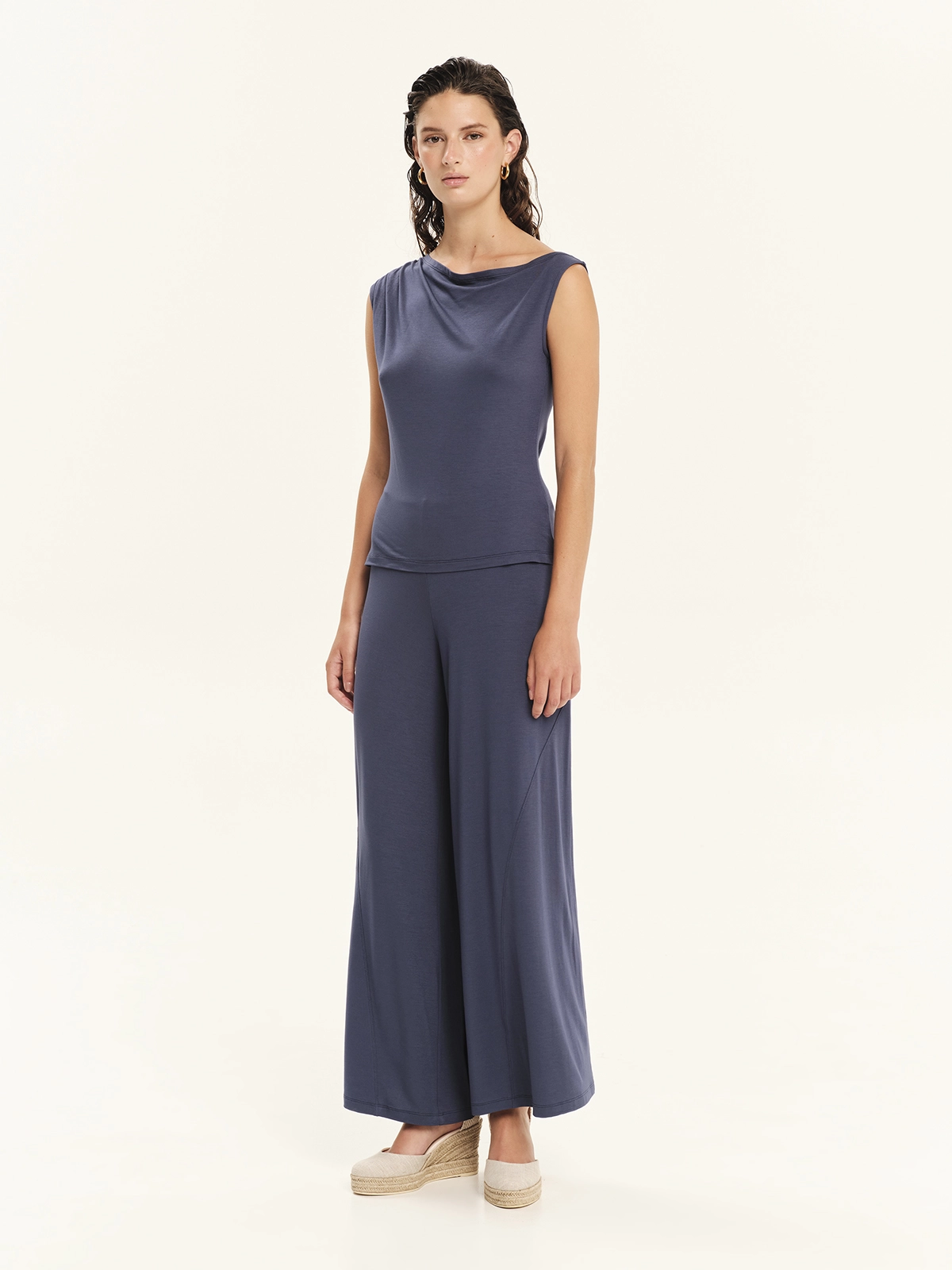 Παντελόνι από ελαστική LENZINGTM ECOVEROTM βισκόζη σε φαρδιά γραμμή. Έχει λάστιχο στη μέση για άνετη εφαρμογή ενώ τα πλαϊνά κοψίματα αποτελούν μια ιδιαίτερη λεπτομέρεια σε ένα casual ρούχο. Ανάλαφρο και απαλό, είναι ιδανικό για καθημερινά σύνολα ενώ αποτελεί βασικό κομμάτι της γυναικείας γκαρνταρόμπας.