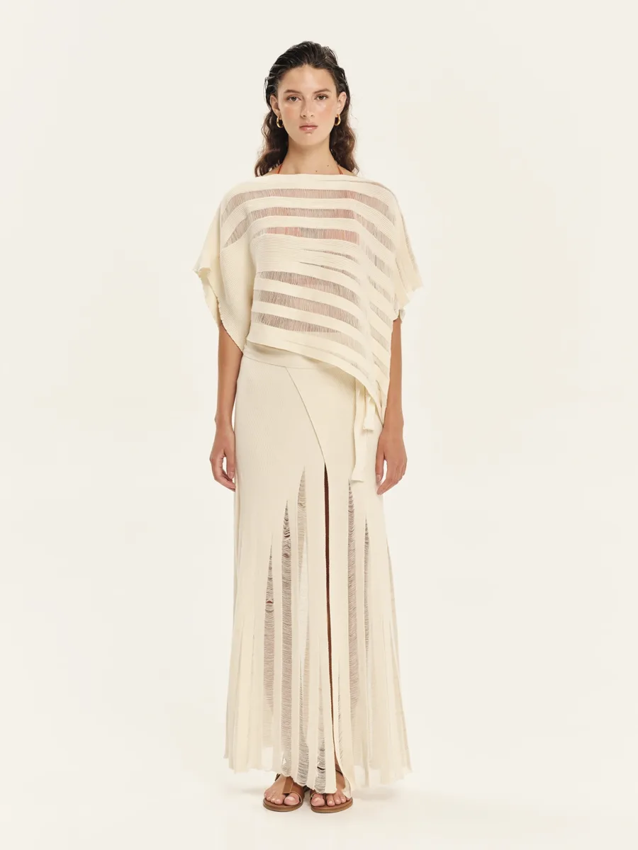 Oversized πλεκτό τοπ από 100% ελληνικό βαμβάκι με διάτρητες λεπτομέρειες. Καλύπτει απαλά τη σιλουέτα ενώ η ασυμμετρία τονίζει το ιδιαίτερο σχέδιό του με την διάτρητη πλέξη. Ένα μοναδικό σχέδιο με resort χαρακτήρα που συνδυάζεται ιδανικά με τα κάτω μέρη και τα beachwear σχέδια της συλλογής.