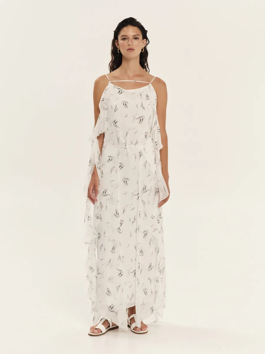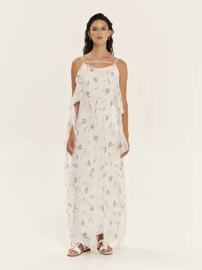 Φόρεμα από printed ζορζέτα σε off-white απόχρωση με εσωτερικό δέσιμο στην πλάτη και εξωτερικό δέσιμο στο μπροστινό μέρος, τονίζοντας τη μέση με κομψότητα. Διαθέτει διακριτικές οριζόντιες λωρίδες στη λαιμόκοψη εμπρός και πίσω και ελεύθερες κορδέλες που σχηματίζουν αέρινα βολάν. Η εσωτερική φόδρα εξασφαλίζει άνεση και άψογη εφαρμογή, ενώ το ναυτικό τύπωμα ολοκληρώνει τον εκλεπτυσμένο χαρακτήρα του φορέματος.