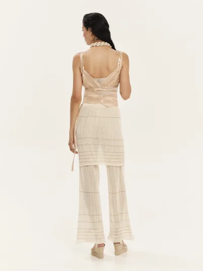 Κρουαζέ bralette από crinkled rayon ύφασμα με ιριδίζουσα γυαλάδα. Έχει κολακευτική “V” λαιμόκοψη με λεπτές τιράντες και δένει γύρω απ’ το σώμα δημιουργώντας ένα resort και beachwear style. Συνδυάζεται ιδανικά με τα κάτω μέρη της συλλογής συνθέτοντας μοναδικά, cool και stylish καλοκαιρινά looks.