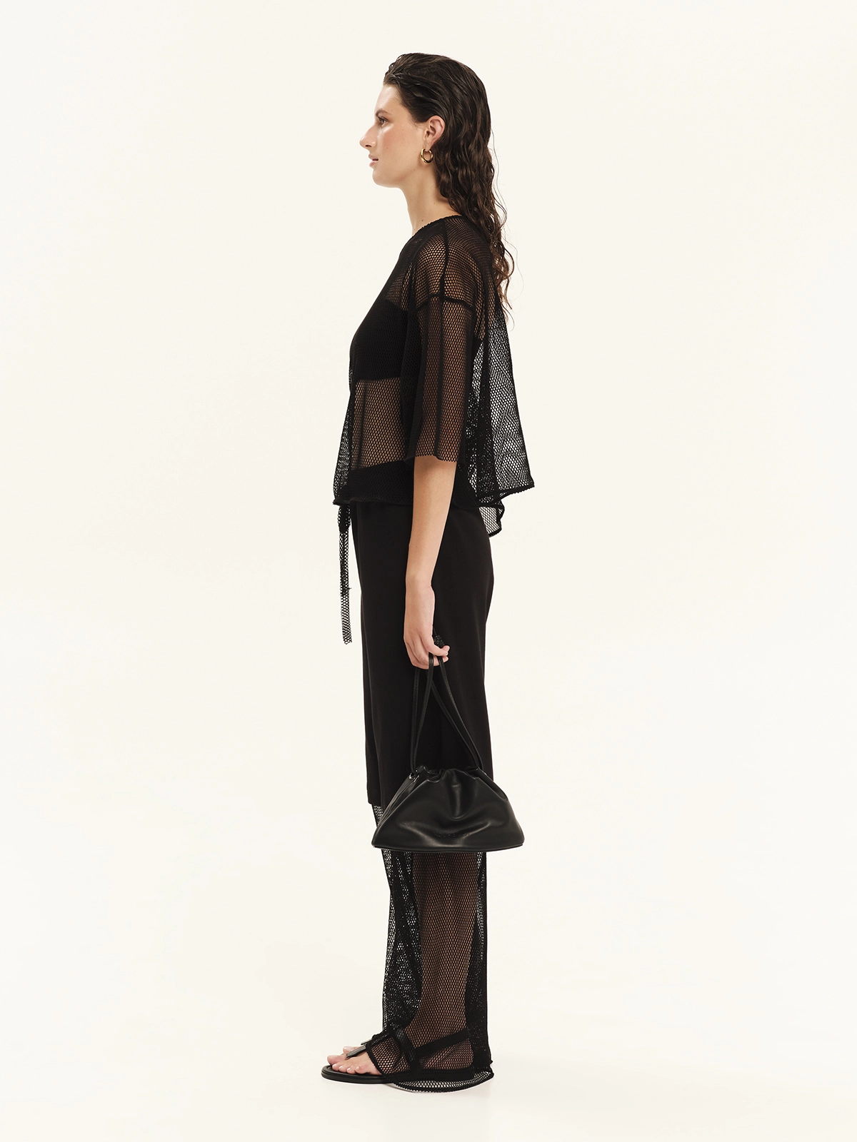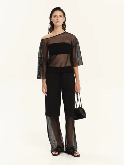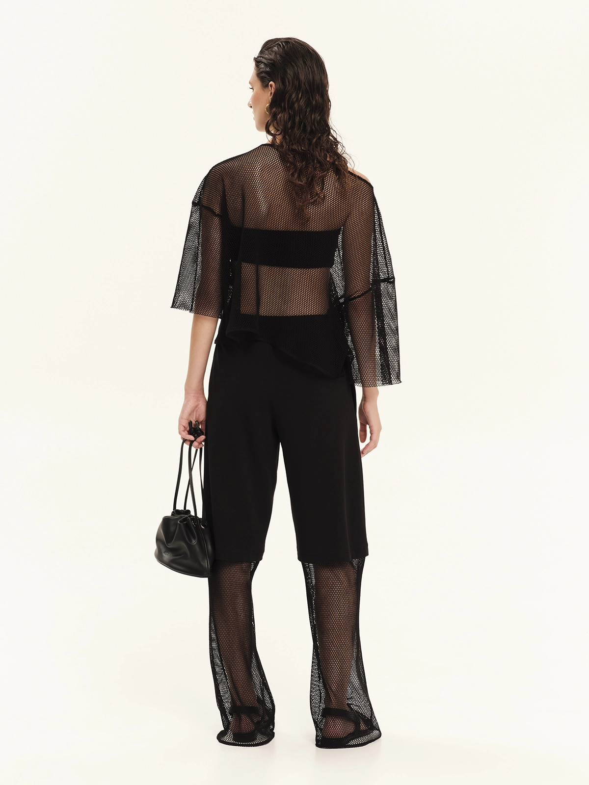 Crop τοπ από 100% βαμβακερό δίχτυ. Διαθέτει φαρδιά γραμμή με κοντά μανίκια και χαμόγελο λαιμόκοψη. Άνετο, δροσερό και ευκολοφόρετο, αποτελεί ένα ιδιαίτερο statement κομμάτι με resort χαρακτήρα.