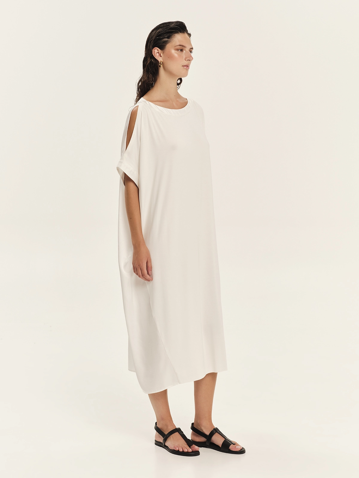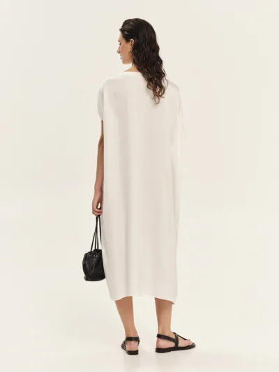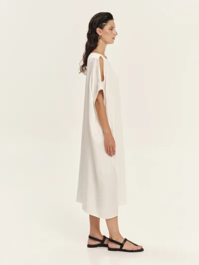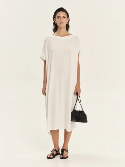 Loose maxi φόρεμα που συνδυάζει jersey bamboo στο μπροστινό μέρος με silky βισκόζη στην πλάτη, δημιουργώντας μια εκλεπτυσμένη αντίθεση υφών και κίνησης. Η χαλαρή γραμμή προσφέρει άνεση και σύγχρονη κομψότητα, ενώ η ασυμμετρία στα μανίκια προσθέτει αρχιτεκτονικό ενδιαφέρον στο σχέδιο. Η μία πλευρά διαθέτει μανίκι με άνοιγμα στους ώμους, αποκαλύπτοντας διακριτικά το δέρμα, ενώ η άλλη πλευρά καλύπτει τον ώμο με καθαρή, μίνιμαλ γραμμή. Ένα statement maxi φόρεμα για εκλεπτυσμένες, μοντέρνες εμφανίσεις.