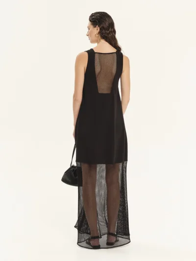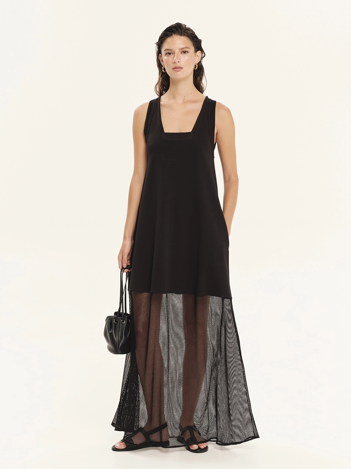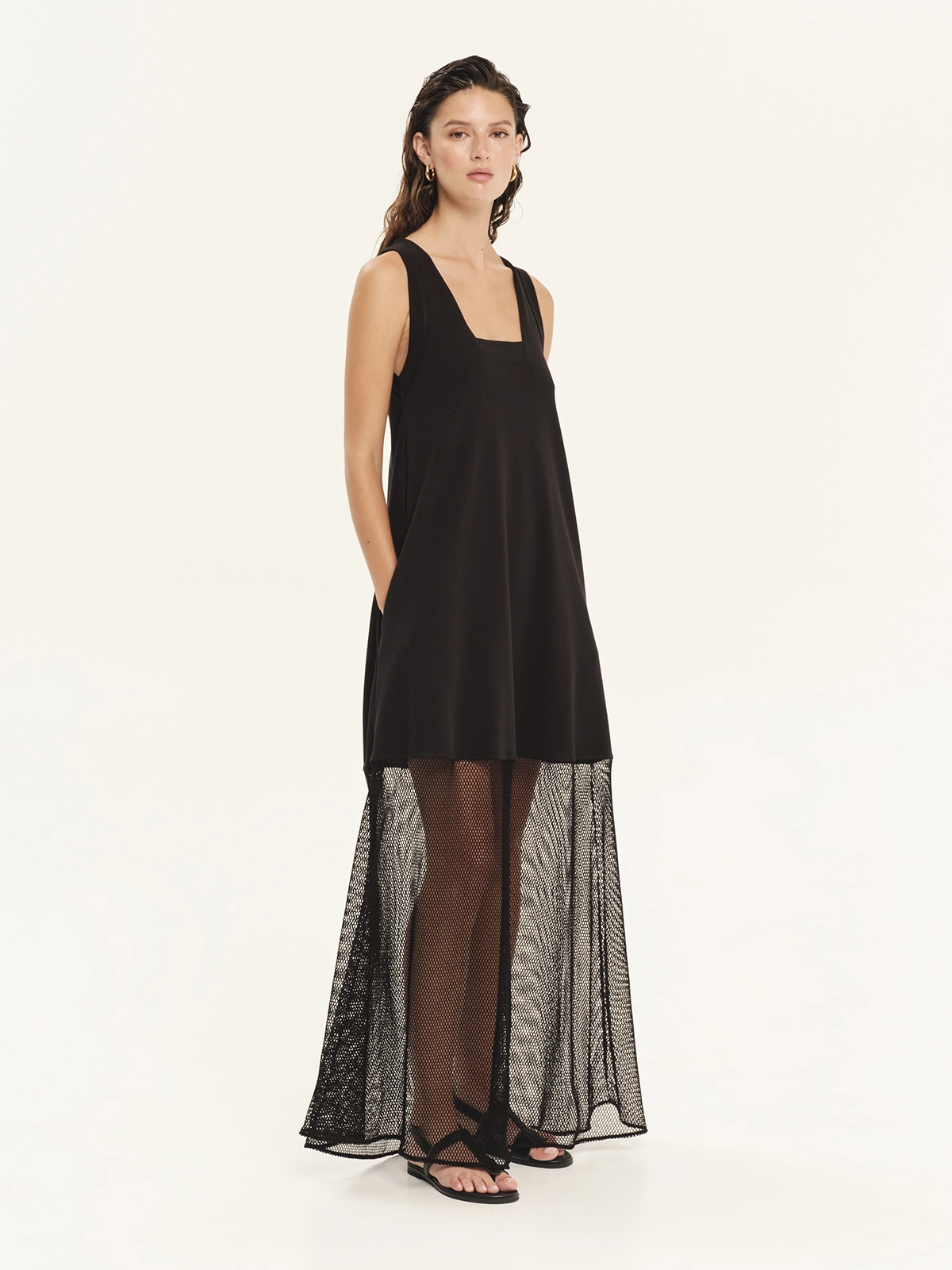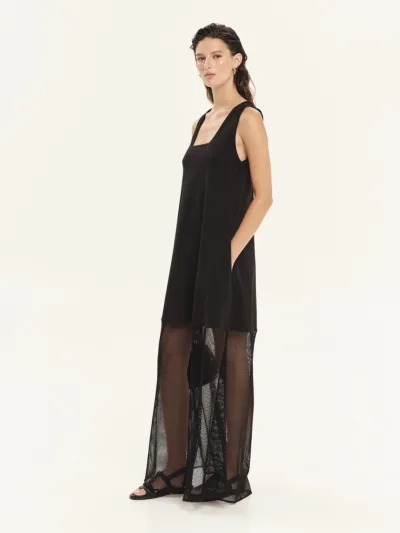 Maxi φόρεμα από 100% βαμβακερό φούτερ σε συνδυασμό με δίχτυ. Διαθέτει άνετη εφαρμογή με γεωμετρικά κοψίματα και διαφάνειες στην πλάτη και στο κάτω μέρος. Είναι αμάνικο με τετράγωνη λαιμόκοψη και πλαϊνές τσέπες. Ένα cool και σύγχρονο statement κομμάτι, ιδανικό για καλοκαιρινές εμφανίσεις.