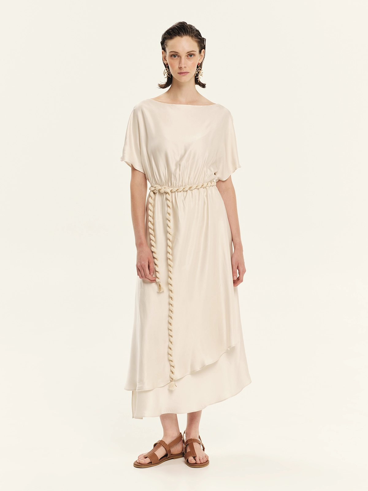 Μίντι φόρεμα από silky βισκόζη με κοντά μανίκια και χαμόγελο λαιμόκοψη, που αγκαλιάζει απαλά το σώμα με θηλυκή άνεση. Το λάστιχο στη μέση τονίζει τη σιλουέτα, ενώ η κρουαζέ φούστα με ασυμμετρία δημιουργεί ρευστή κίνηση και δυναμικό, μοντέρνο αποτέλεσμα. Η μεταξένια υφή της silky βισκόζης προσφέρει απαλή αίσθηση στο δέρμα και εκλεπτυσμένη λάμψη, καθιστώντας το φόρεμα ιδανικό για βραδινές, κομψές εμφανίσεις.