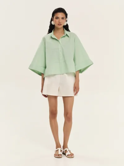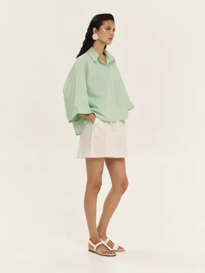 Φαρδύ πουκάμισο από 100% βαμβακερή ριγέ ποπλίνα σε fun, καλοκαιρινές αποχρώσεις. Διαθέτει μανίκια 3/4 και κλείνει μπροστά με κουμπιά σε ξεχωριστή, ιδιαίτερη τοποθέτηση. Ο σχεδιασμός του, με διαφορετική διάταξη των ριγών στα μανίκια και στο στρίφωμα, το καθιστά ένα από τα πιο επιθυμητά σχέδια της καλοκαιρινής συλλογής. Ένα premium πουκάμισο που συνδυάζει άνεση, κομψότητα και σύγχρονη αισθητική, ιδανικό για daywear και resort εμφανίσεις.