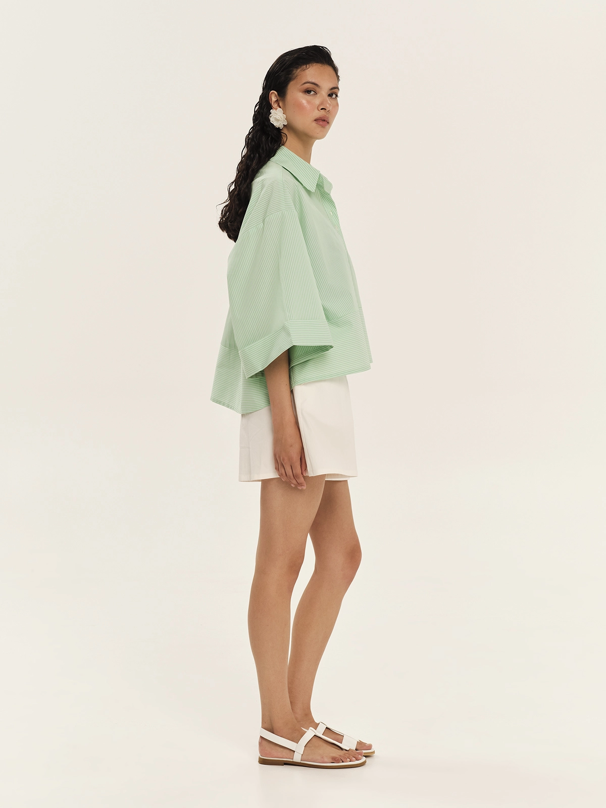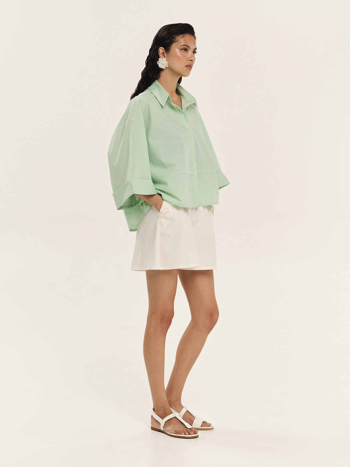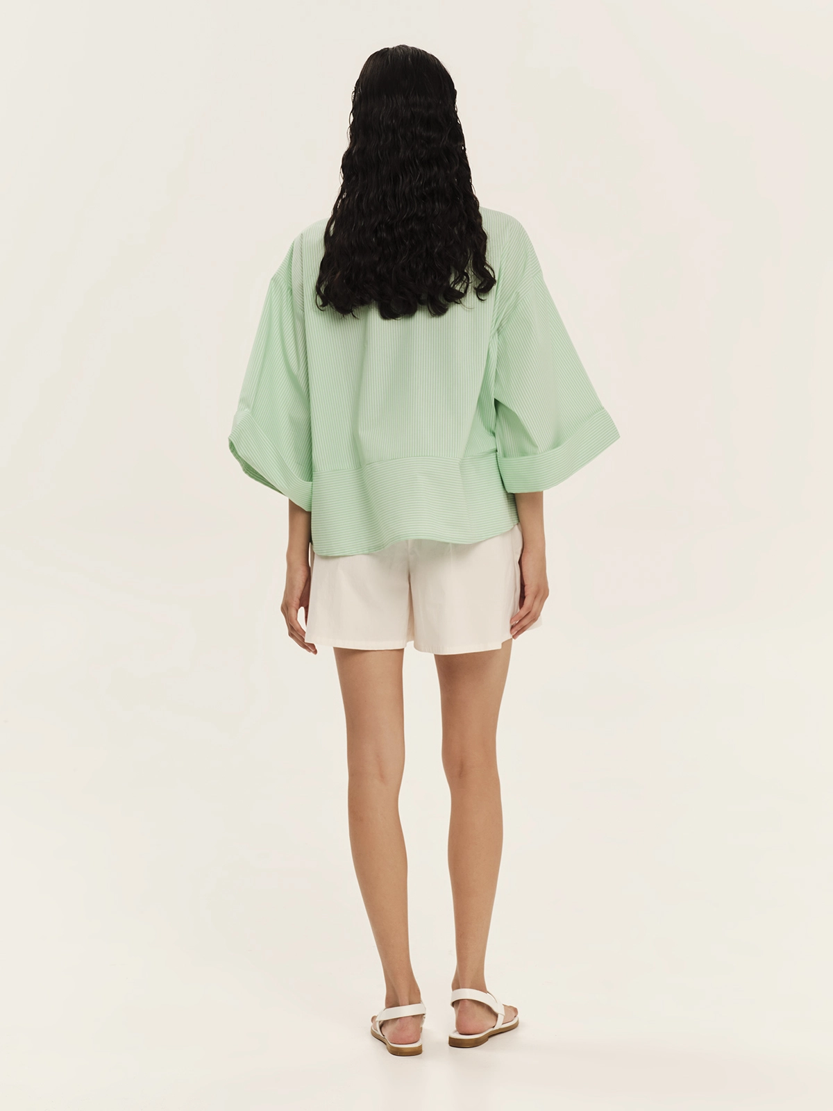 Φαρδύ πουκάμισο από 100% βαμβακερή ριγέ ποπλίνα σε fun, καλοκαιρινές αποχρώσεις. Διαθέτει μανίκια 3/4 και κλείνει μπροστά με κουμπιά σε ξεχωριστή, ιδιαίτερη τοποθέτηση. Ο σχεδιασμός του, με διαφορετική διάταξη των ριγών στα μανίκια και στο στρίφωμα, το καθιστά ένα από τα πιο επιθυμητά σχέδια της καλοκαιρινής συλλογής. Ένα premium πουκάμισο που συνδυάζει άνεση, κομψότητα και σύγχρονη αισθητική, ιδανικό για daywear και resort εμφανίσεις.