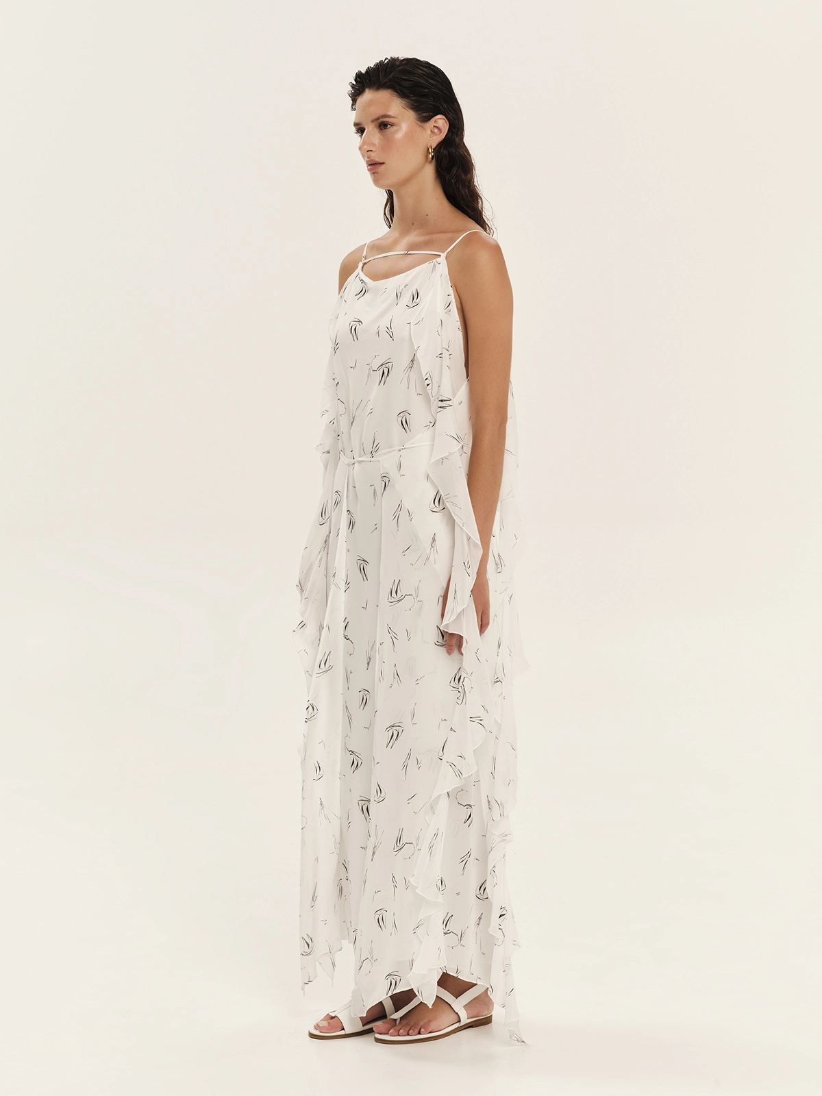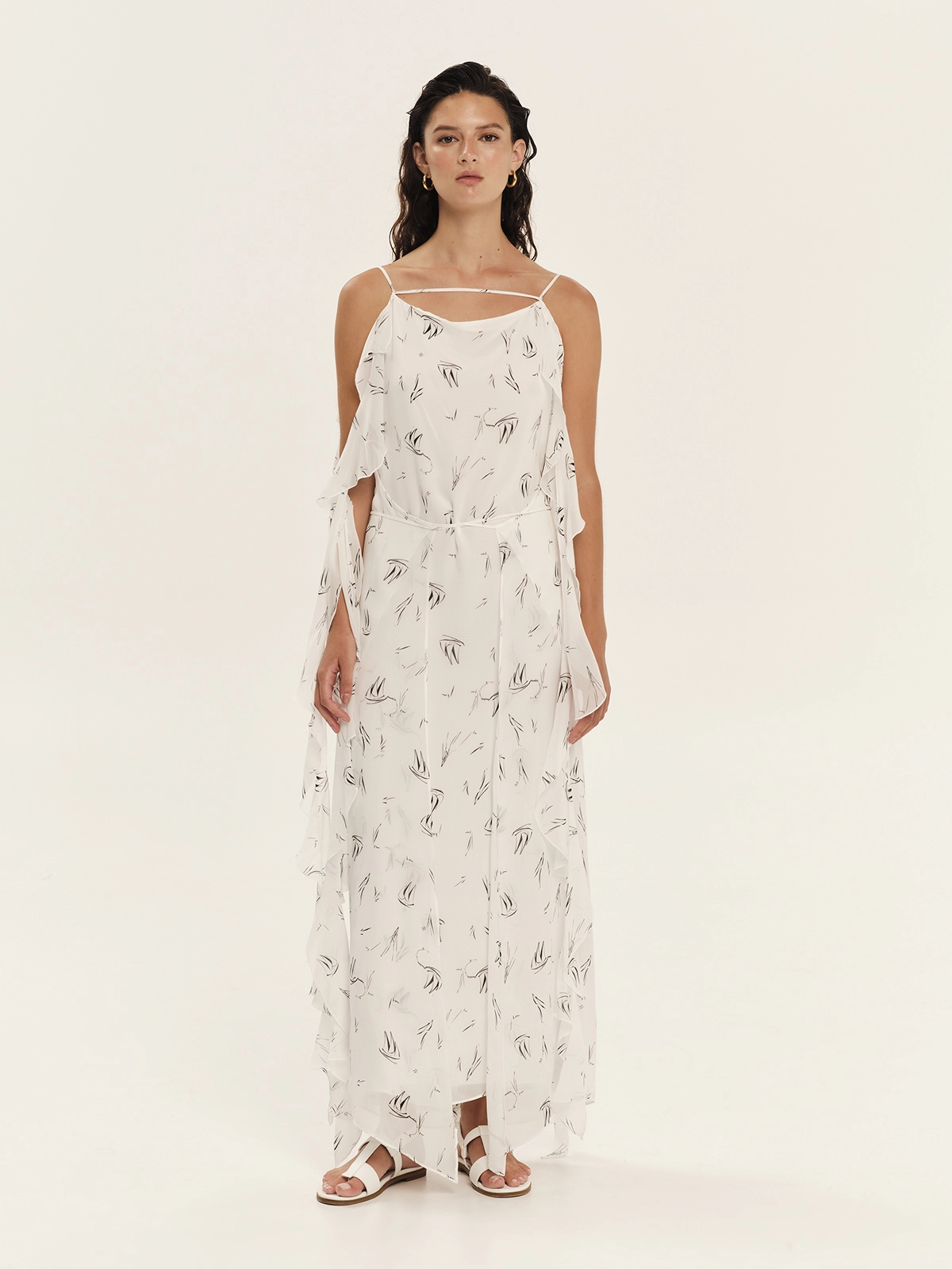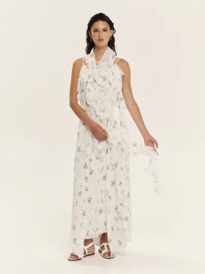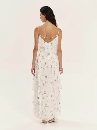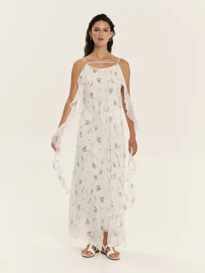 Dress crafted from printed georgette in an off-white shade, featuring an internal tie at the back and an external tie at the front to elegantly define the waist. A subtle, horizontal straps at the neckline and free-flowing ties create airy ruffles. The inner lining ensures comfort and a flawless fit, while the nautical print completes the refined aesthetic.