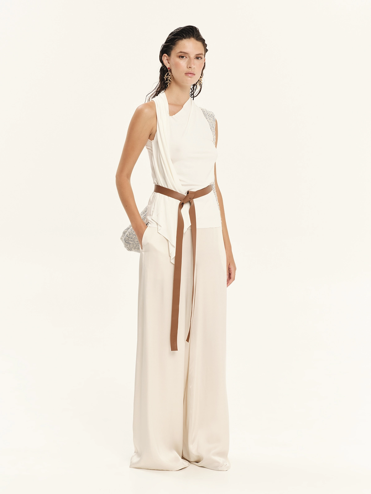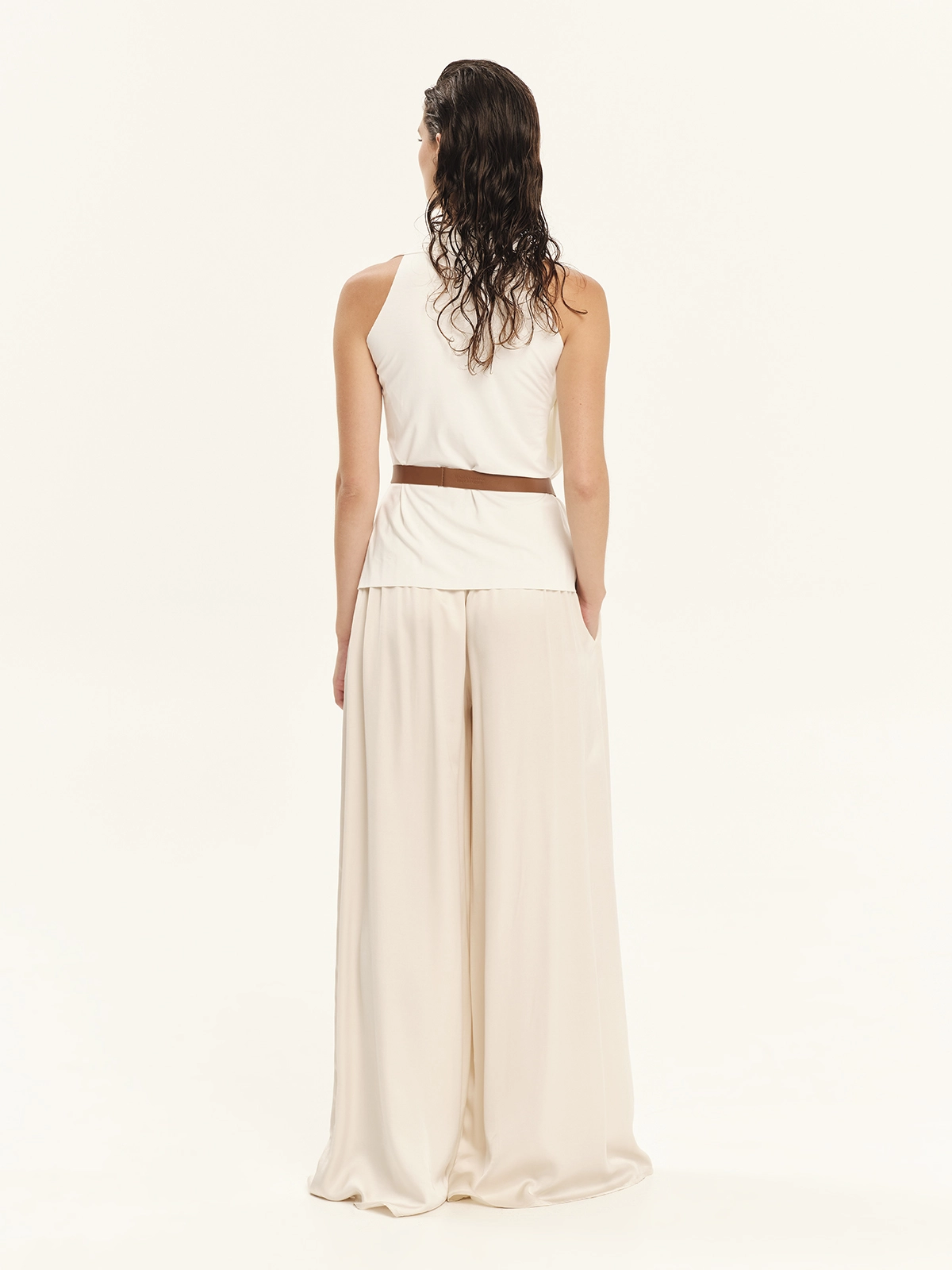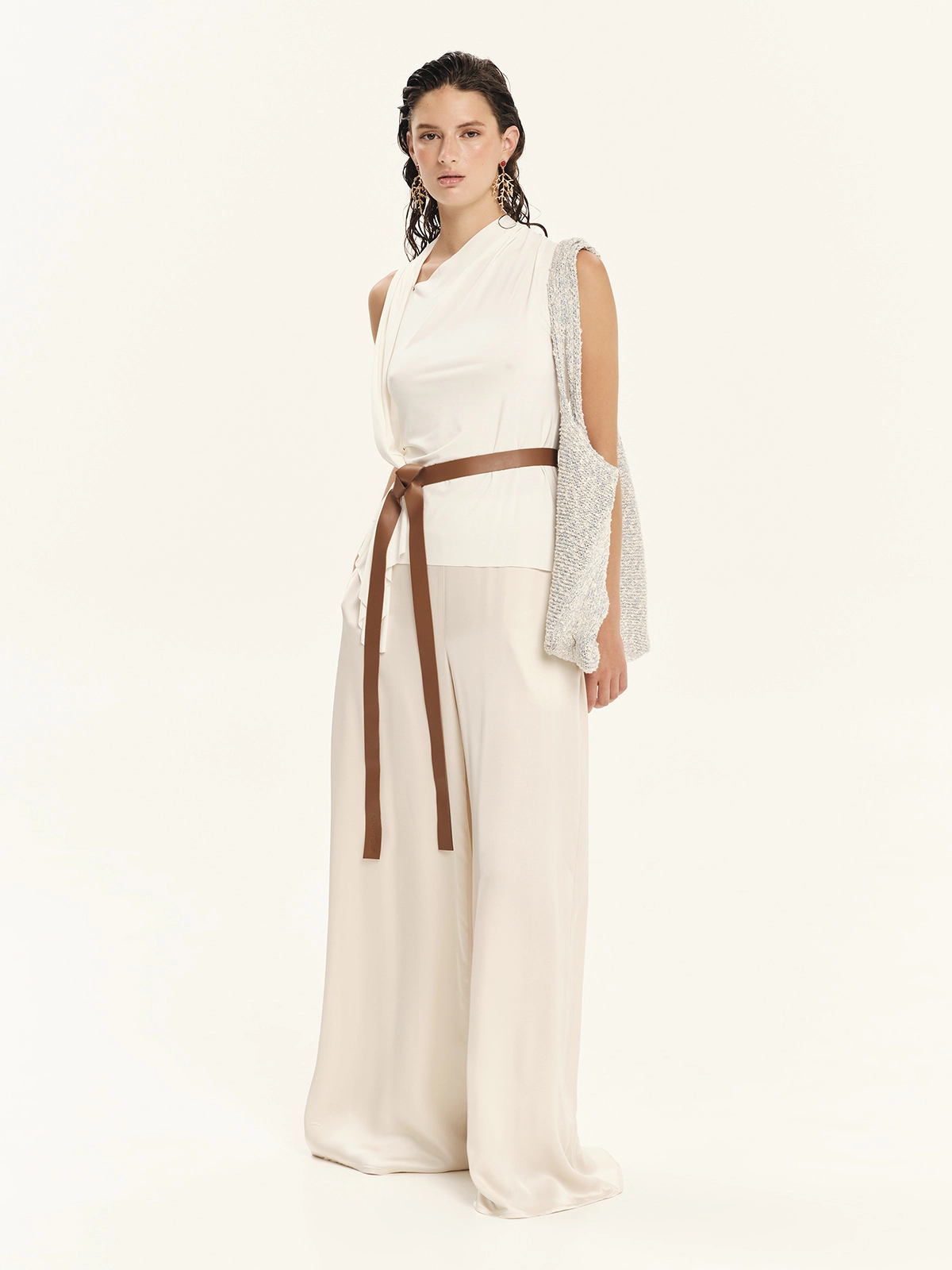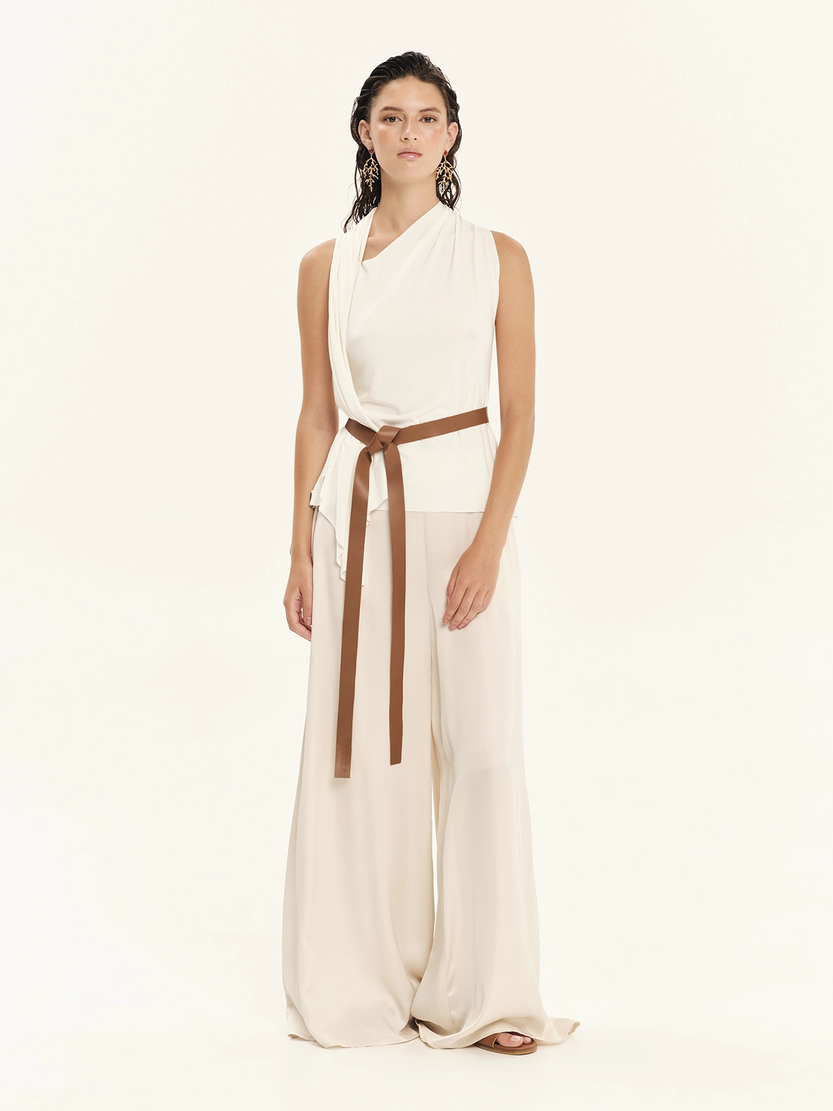 Fitted sleeveless top crafted from bamboo jersey, designed to follow the body with clean, contemporary lines. The subtle panel on one side adds architectural interest and movement, elevating the minimalist design. The soft stretch of bamboo jersey ensures a comfortable fit and versatile styling. A modern essential with distinctive character.