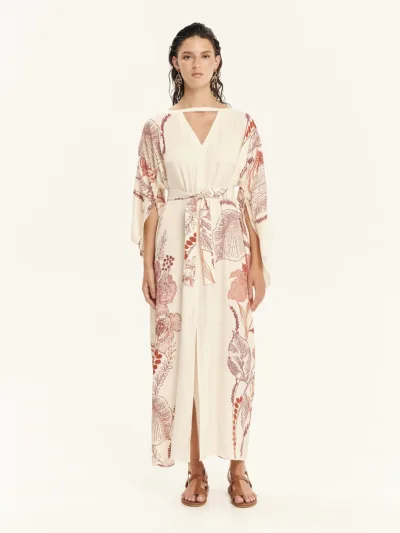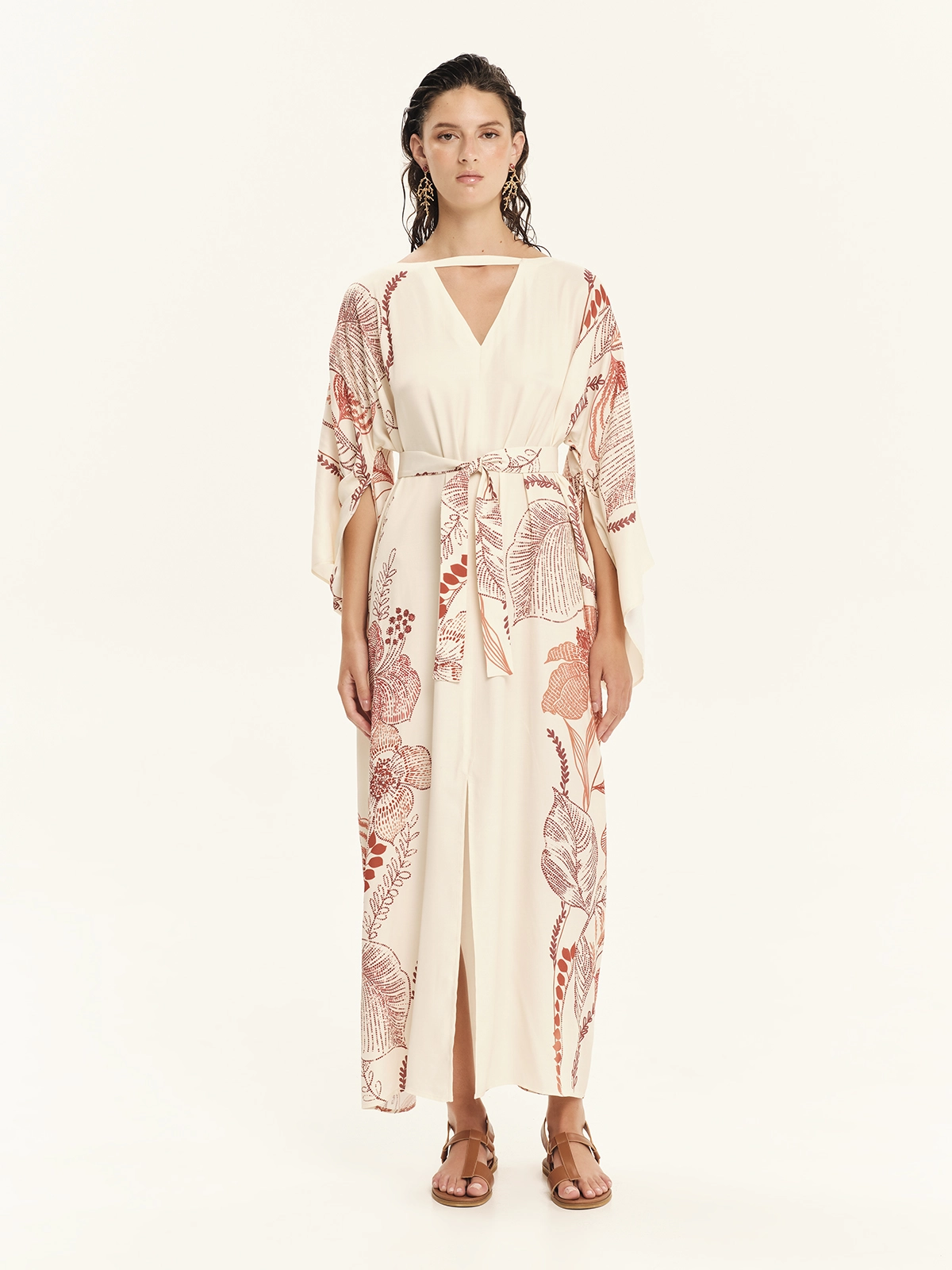 A kimono dress crafted from silky Ecovero viscose, offering fluid movement and refined femininity. Designed with signature kimono sleeves, this dress features a neckband with a subtle V neckline, creating clean lines and balanced elegance. The front slit at the hem adds movement, while the back ties can be styled in multiple ways to define the waist and enhance the silhouette. The distinctive floral print, inspired by Japanese aesthetics, adds depth and character to the design. A striking piece for evening and refined occasions, defined by understated drama and modern elegance.