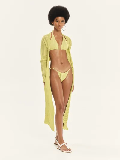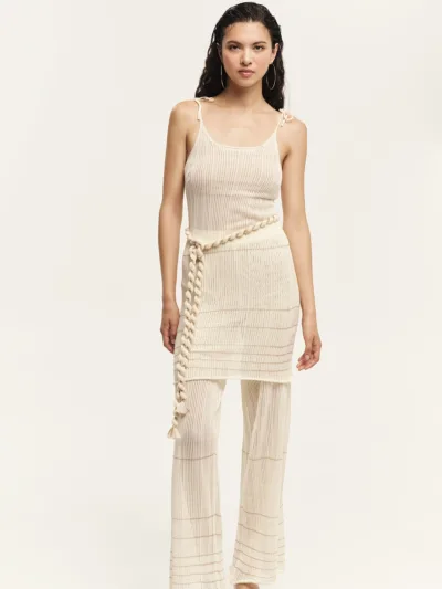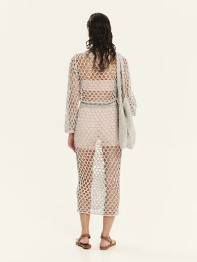 Fitted knitted crop top with long sleeves, crafted from iridescent organic cotton yarn. Featuring an all-over openwork knit, it provides an airy feel and breathable comfort, while the scoop neckline elegantly frames the neck and shoulders. A statement piece perfect for casual or chic summer looks.