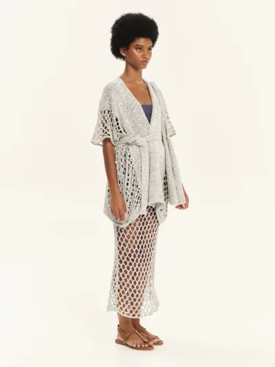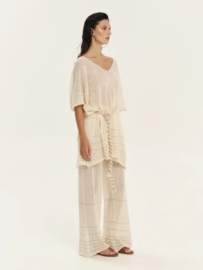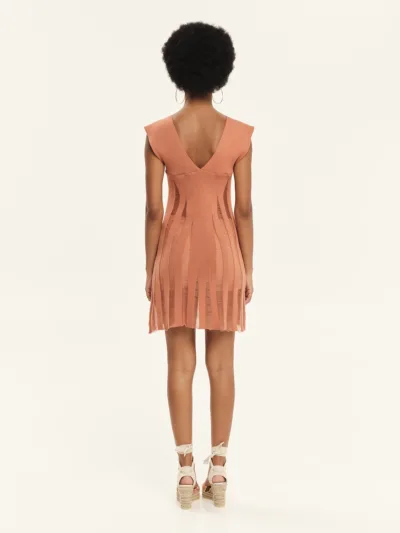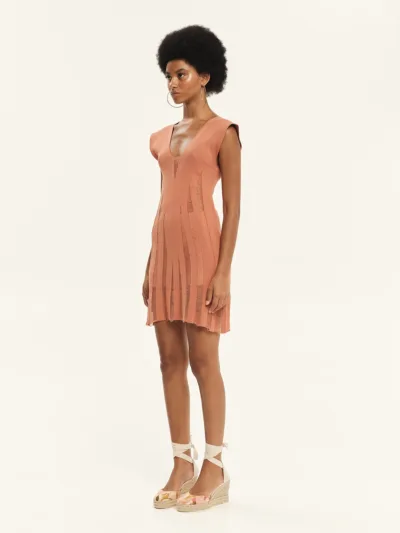 Knitted mini dress made from 100% Greek cotton, featuring perforated details. It softly hugs the silhouette and has a flattering V-neckline. Sleeveless in design, it opens into an A-line shape at the hem. The perforated knitting add a distinctive resort-inspired feel to the piece. An ultra-feminine, summer-ready design, perfect for creating eye-catching looks.