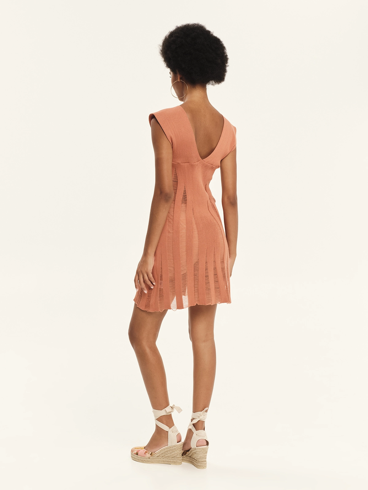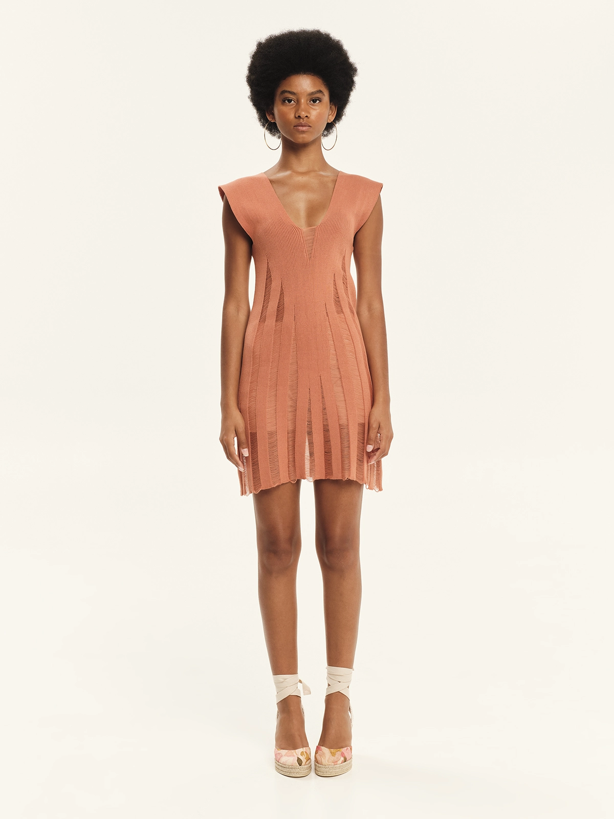 Knitted mini dress made from 100% Greek cotton, featuring perforated details. It softly hugs the silhouette and has a flattering V-neckline. Sleeveless in design, it opens into an A-line shape at the hem. The perforated knitting add a distinctive resort-inspired feel to the piece. An ultra-feminine, summer-ready design, perfect for creating eye-catching looks.