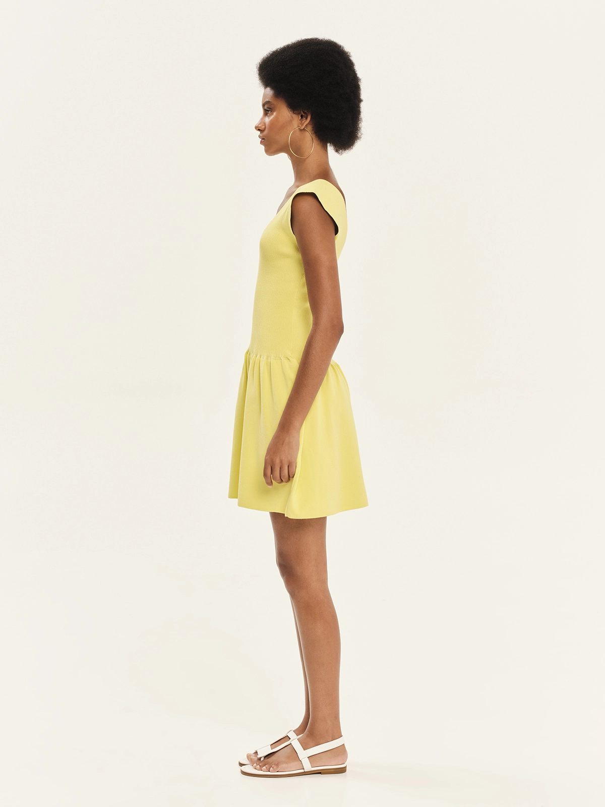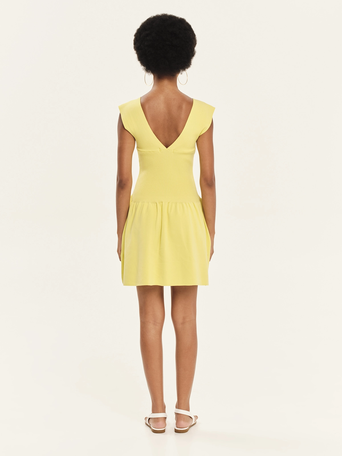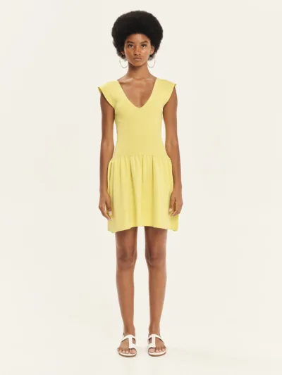 Knitted, mini, sleeveless dress made from elastic viscose yarn. It features a comfortable fit that hugs the silhouette and a flattering V-neckline, while the lower part flares slightly, creating an elegant and feminine look. A quintessential summer design, ideal for outfits from morning to evening.