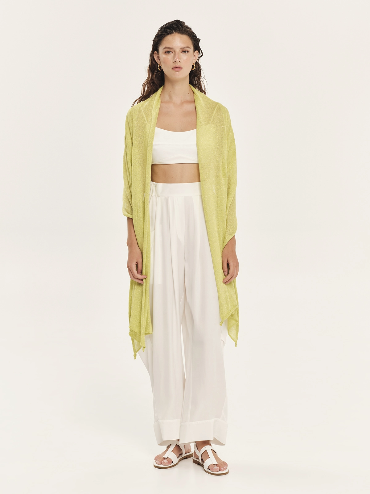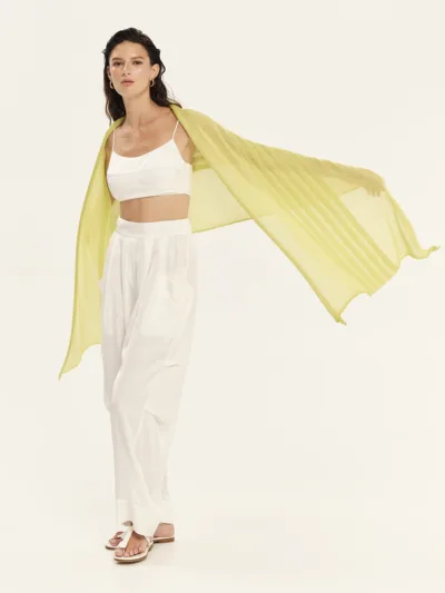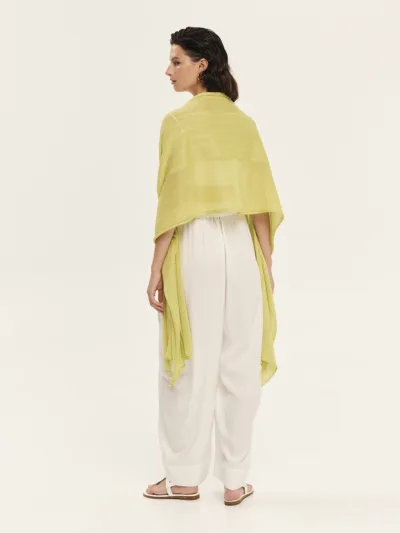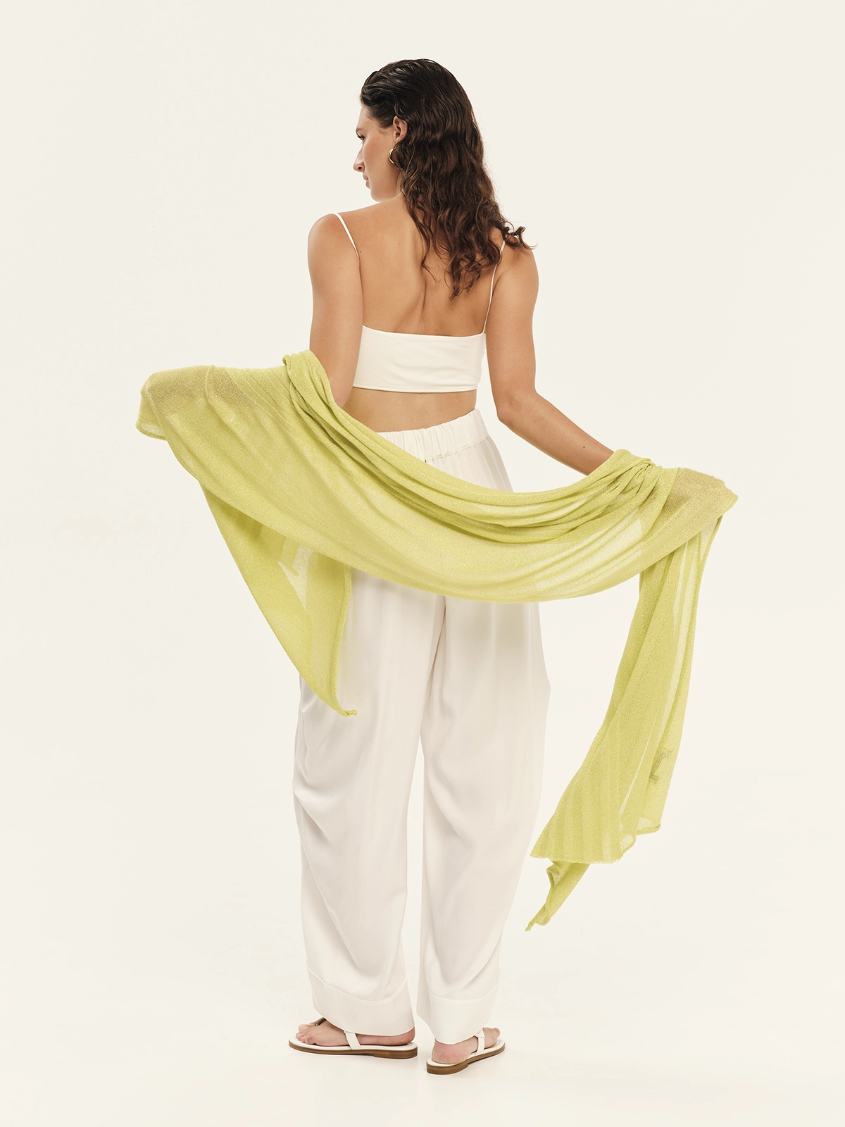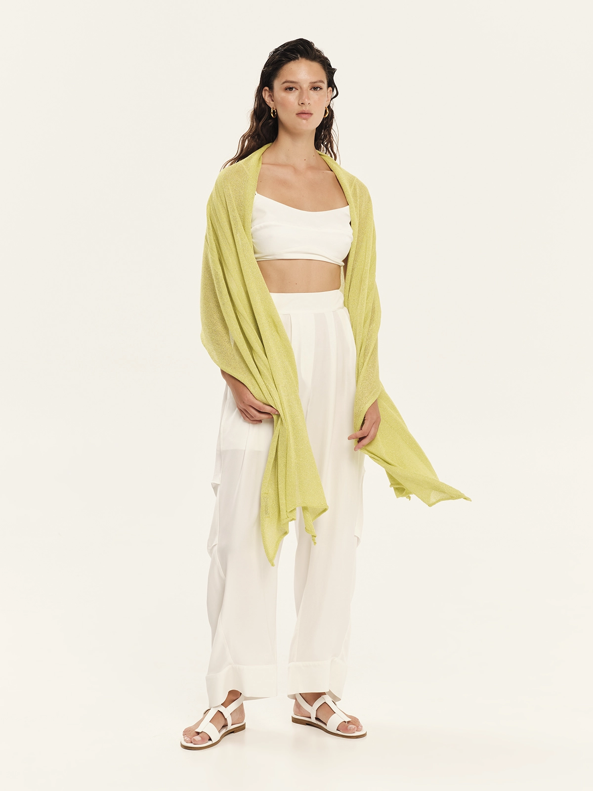 Knitted shawl made from lurex viscose yarn with a distinctive knit pattern, lightweight and easy to wear. A stylish accessory that adds shimmer and elegance to any outfit, perfect for layering or finishing chic and casual looks.