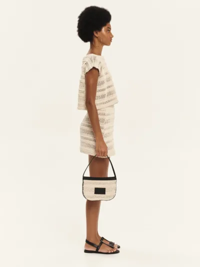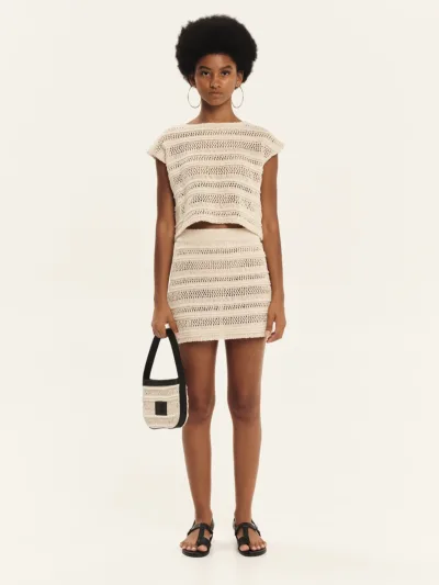 Knit mini skirt made of a blend of cotton and linen yarn. It features a comfortable fit that hugs the silhouette and an elasticated waistband for added comfort. Its distinctive, textured knit is highlighted by the natural fibers of the material, adding depth and character. Comfortable yet stylish, it is a statement piece with a resort-inspired aesthetic, combining practicality and elegance for modern summer looks.