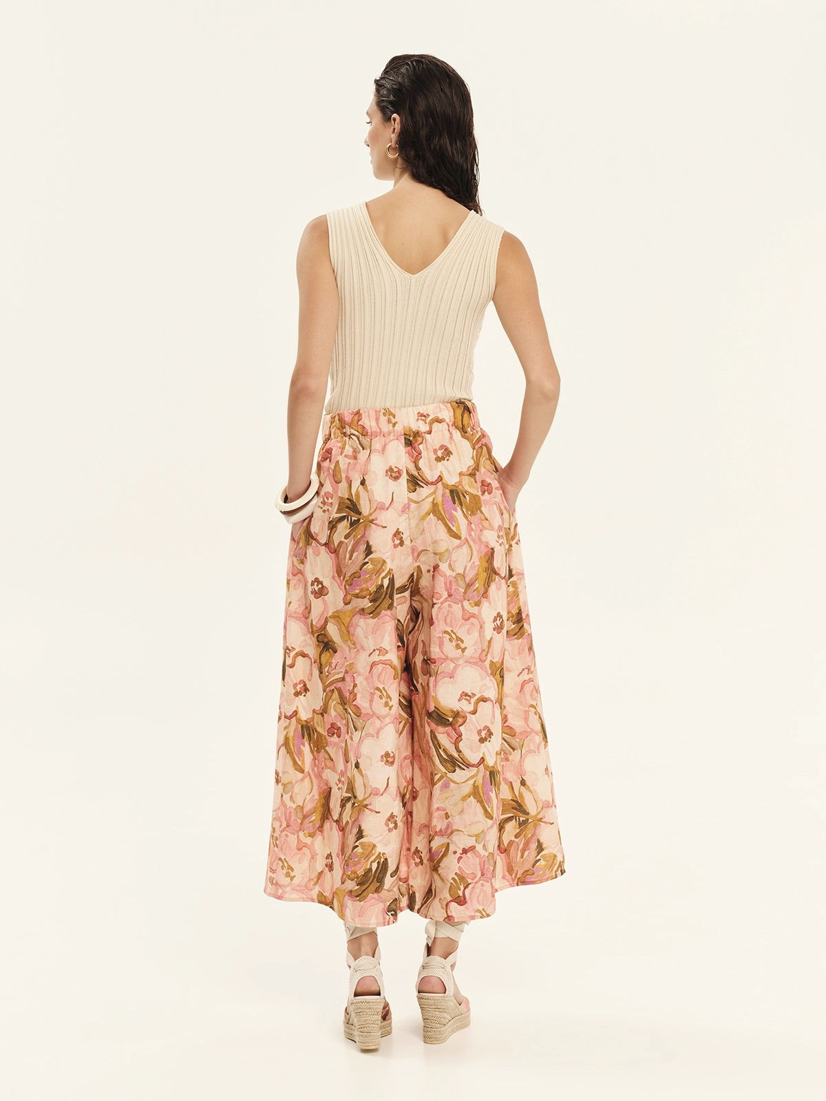Knitted sleeveless top with a front knot, made from elastic viscose yarn. It features a stretchy rib-knitting with a comfortable fit that hugs the silhouette and a flattering V-neckline. The front knot adds a distinctive summer touch, elevating the overall design. It pairs perfectly with the bottoms of the collection to create elegant summer outfits.