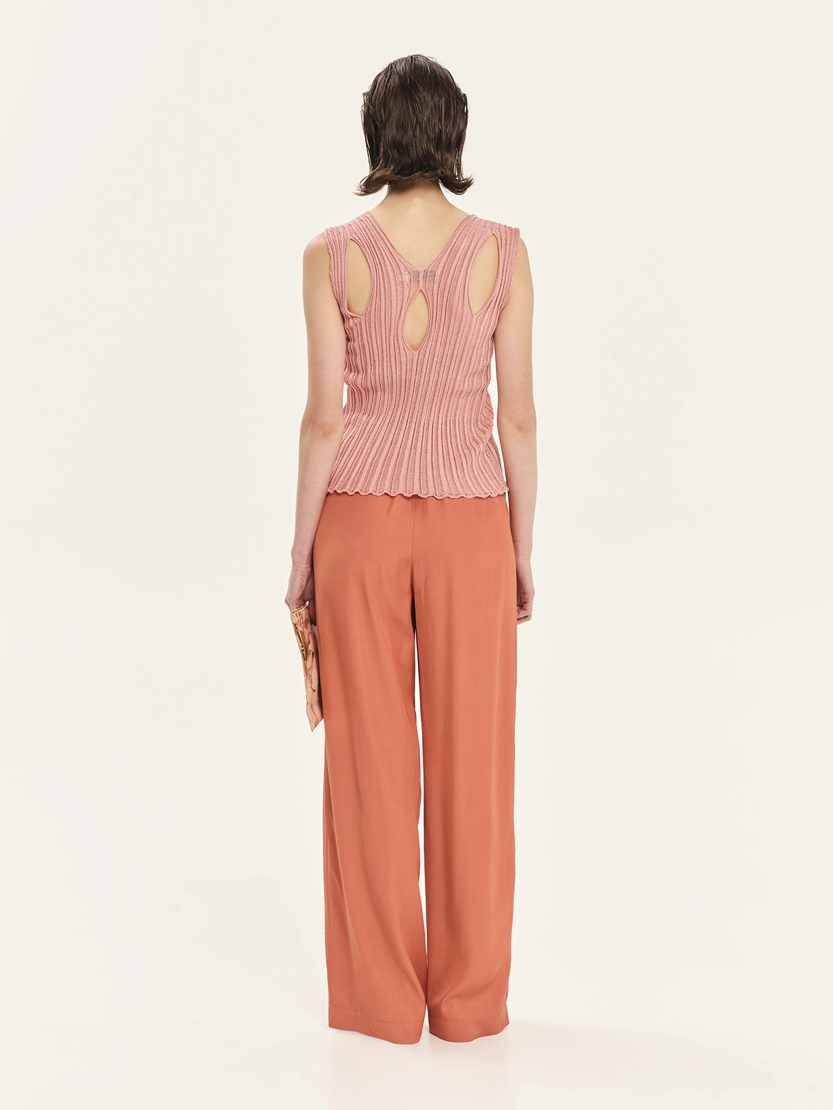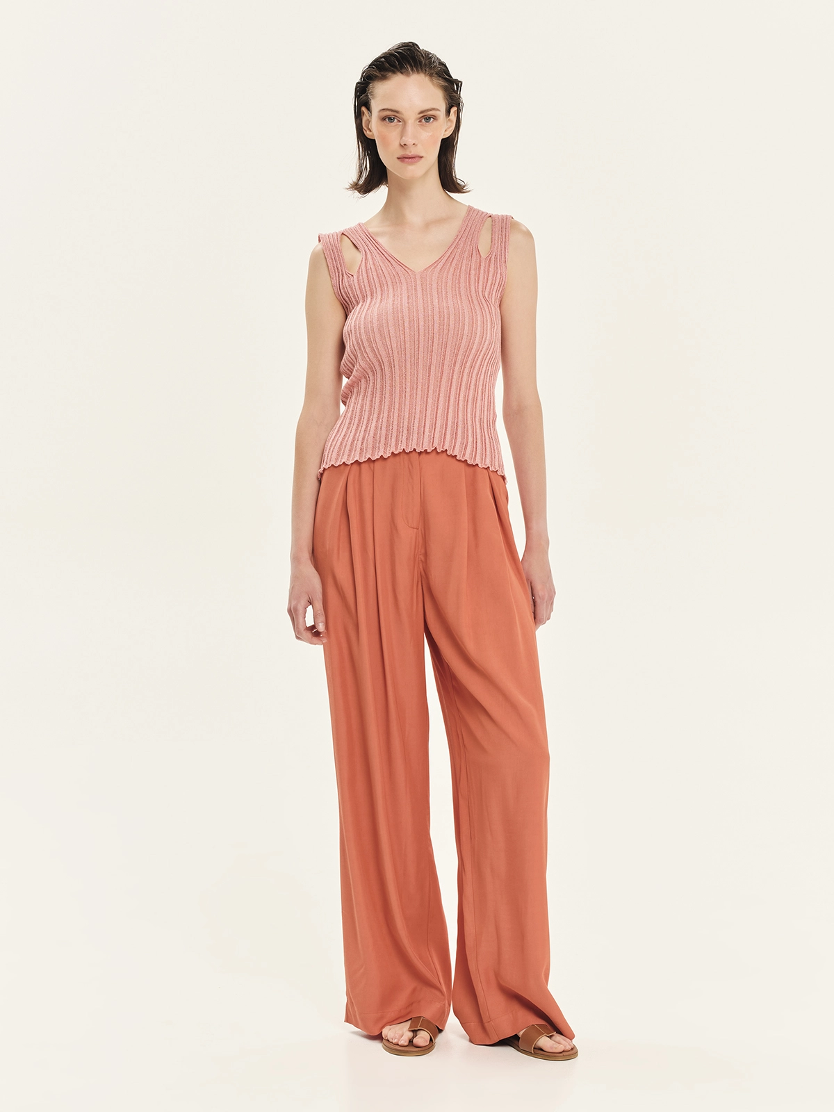 Sleeveless knitted top made from lurex viscose yarn with a flattering rib knit, in a fitted silhouette with a V-neckline. It features subtle cut-outs at the front shoulders and distinctive details on the back, offering a stylish and fashion-forward look. Perfect for chic evening outfits or resort looks with shimmer.
