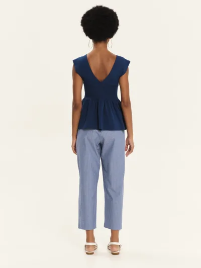 Knitted sleeveless top with ruffle detailing and a flattering V-neckline, made from elastic viscose yarn. It features a comfortable fit that gently hugs the silhouette, while the ruffle at the hem adds an elegant, feminine touch. A distinctly summery design that pairs effortlessly with the bottoms of the collection for refined yet comfortable outfits.
