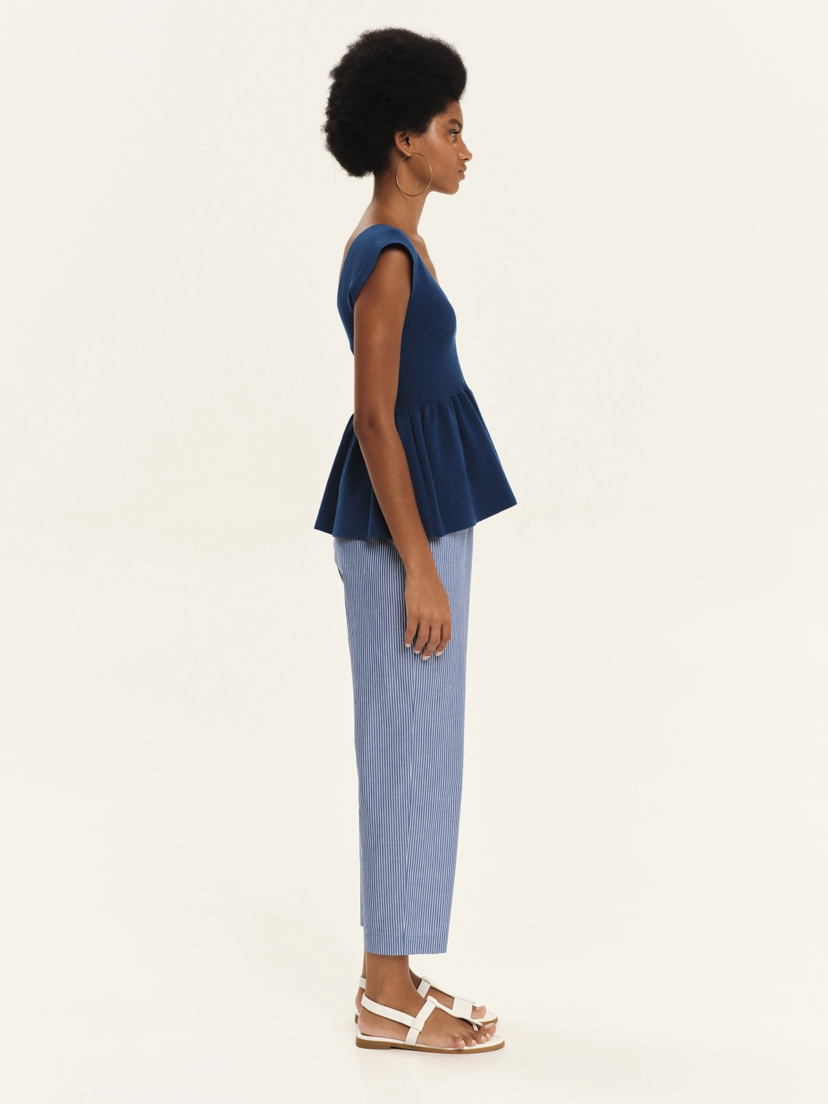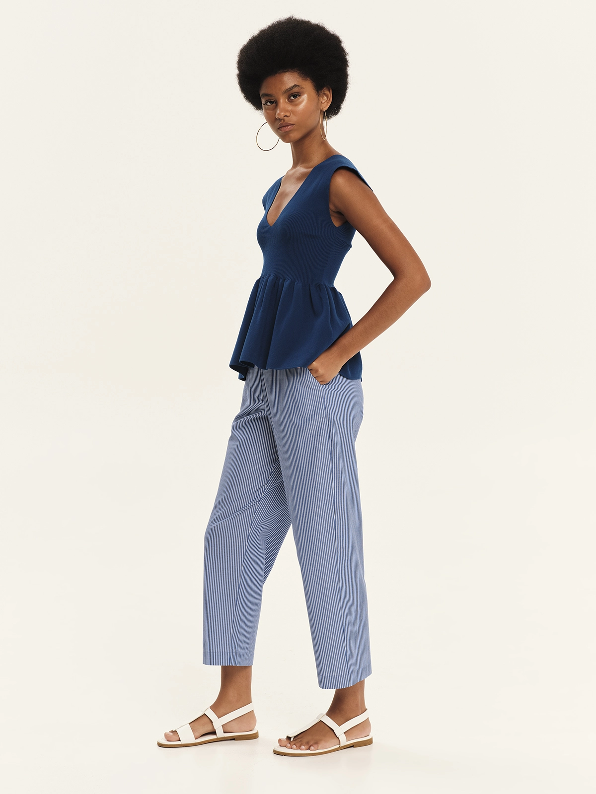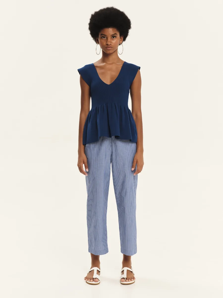 Knitted sleeveless top with ruffle detailing and a flattering V-neckline, made from elastic viscose yarn. It features a comfortable fit that gently hugs the silhouette, while the ruffle at the hem adds an elegant, feminine touch. A distinctly summery design that pairs effortlessly with the bottoms of the collection for refined yet comfortable outfits.