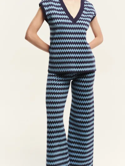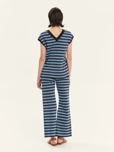 Knitted long trousers made from 100% organic cotton. They feature an elastic waist band and a wide, comfortable shape. Their unique, bespoke jacquard knit in distinctive color combinations is inspired by vintage motifs and is beautifully rendered on their natural yarn. Elegant and unique, they are a statement and stylish proposal for our summer outfits.