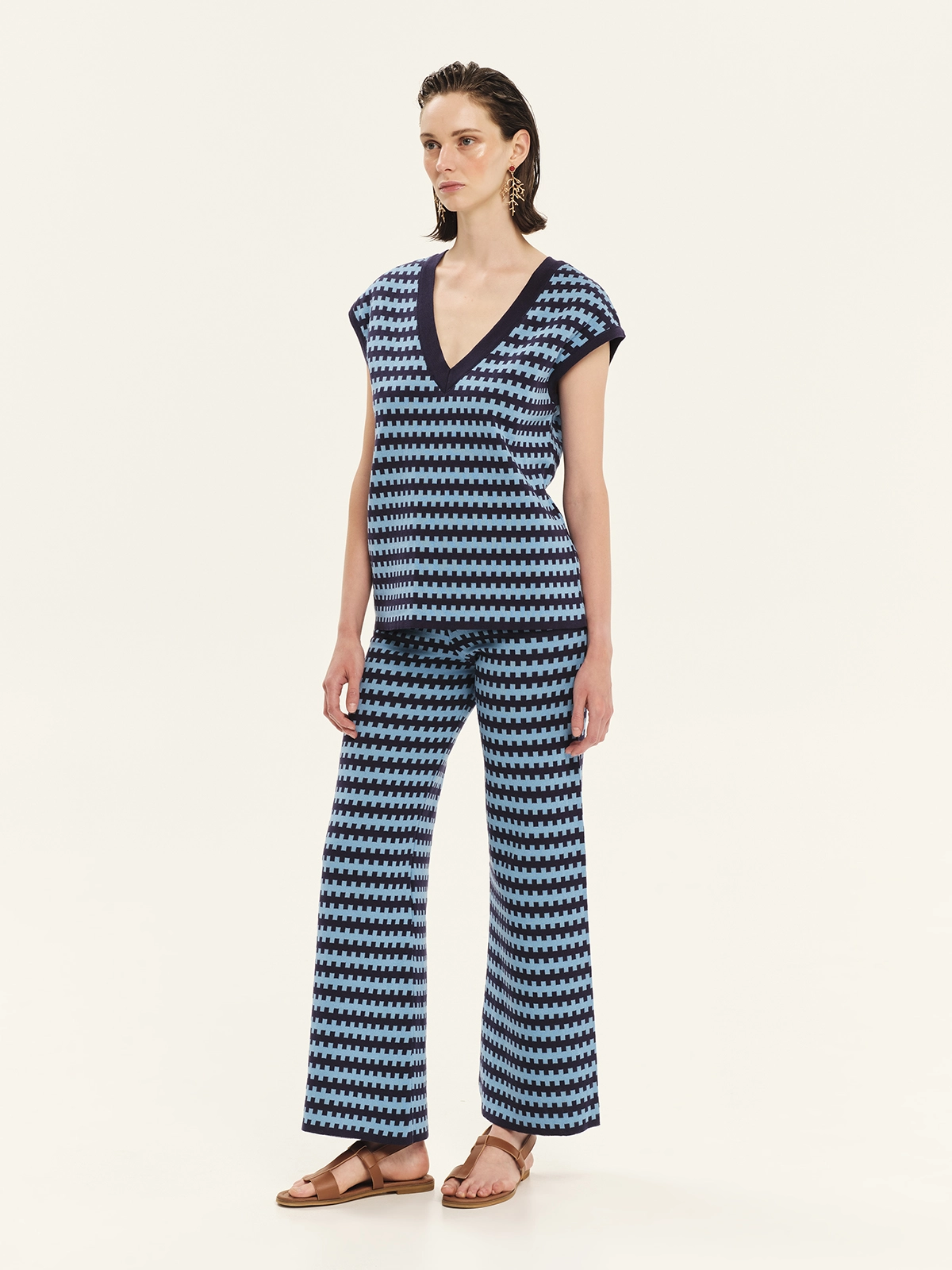 Knitted long trousers made from 100% organic cotton. They feature an elastic waist band and a wide, comfortable shape. Their unique, bespoke jacquard knit in distinctive color combinations is inspired by vintage motifs and is beautifully rendered on their natural yarn. Elegant and unique, they are a statement and stylish proposal for our summer outfits.