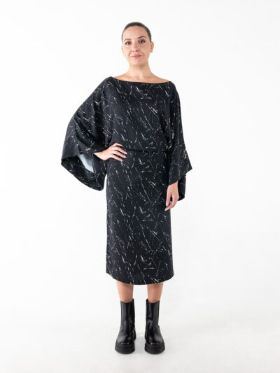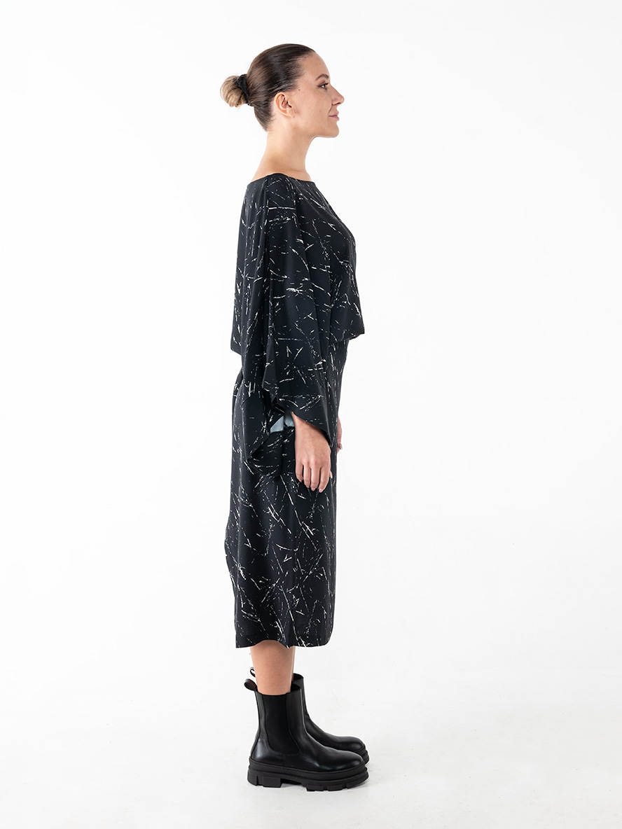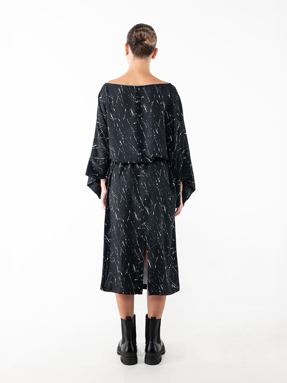 Long dress with ties, made from 100% viscose flannel with a soft, smooth texture. It features a relaxed straight-line silhouette, a soft scoop neckline, and wide 3/4-length sleeves. When belted, it creates a gentle drape around the waist with fluid pleats that flatter the figure. Its distinctive linear print in off-white and black evokes abstract, delicate brushstrokes—emphasizing the collection’s uniqueness and expressive design. Elegant, modern, and versatile, it’s the perfect choice for effortlessly polished looks.
