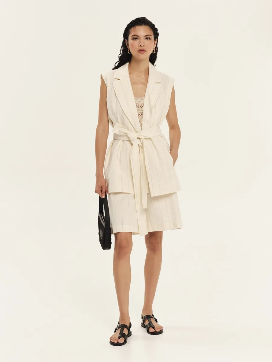 Long vest crafted from a cotton-linen blend, featuring a clean, minimalist silhouette with a waist tie that cinches to define the figure. Its elegant design allows for layering or standalone styling, offering versatility and contemporary appeal. A premium piece combining sophistication, comfort, and refined detailing—perfect for casual chic looks.