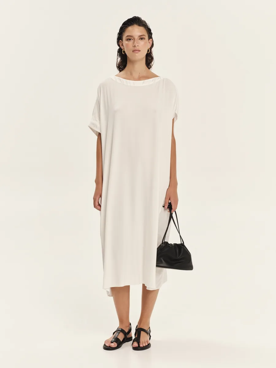 Loose maxi dress combining bamboo jersey at the front with silky viscose at the back, creating a refined contrast of textures and movement. The relaxed silhouette offers comfort and modern elegance, while the asymmetric sleeves add architectural interest to the design. One side features a sleeve with an open shoulder detail, subtly revealing the skin, while the opposite side softly covers the shoulder with a clean, minimalist line. A statement maxi dress for refined, modern looks.