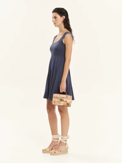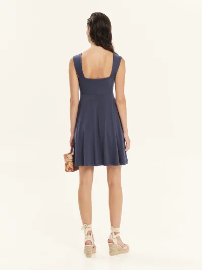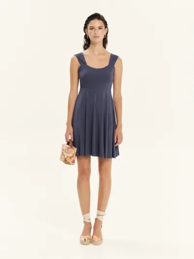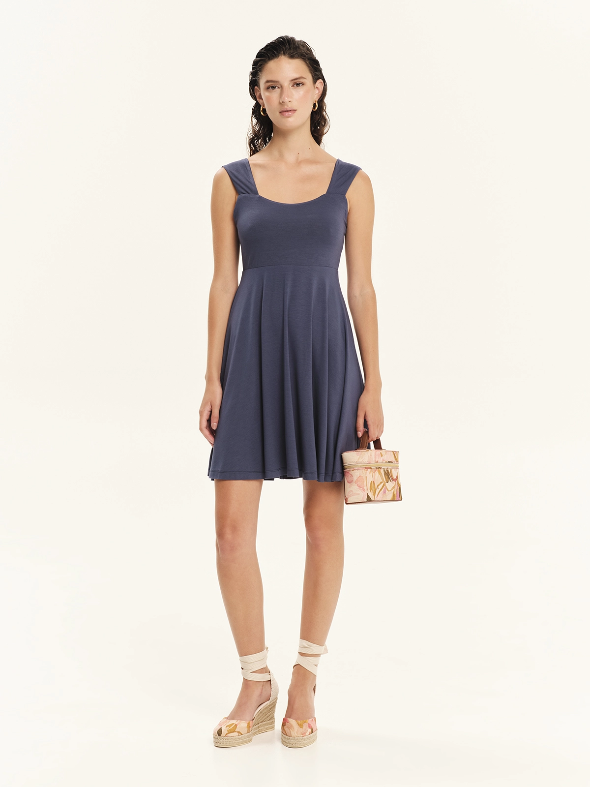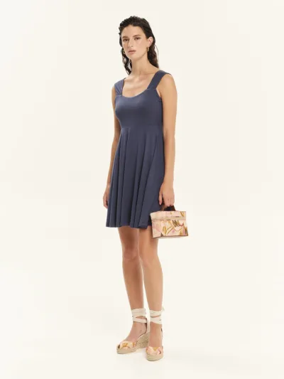 Mini dress crafted from elastic LENZING™ ECOVERO™ viscose, featuring cap sleeves with banded edges and a flattering curved neckline. The fitted upper body balances beautifully with the flared skirt, creating a feminine and comfortable silhouette.