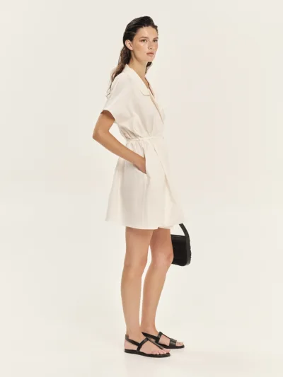 Mini wrap dress crafted from elastic cotton poplin with a crinkle texture, featuring a slim tie at the waist and refined lapels. The fit gently hugs the silhouette, offering both comfort and elegance and has side pockets. A premium mini dress that blends contemporary design with practicality, perfect for daywear and resort looks.