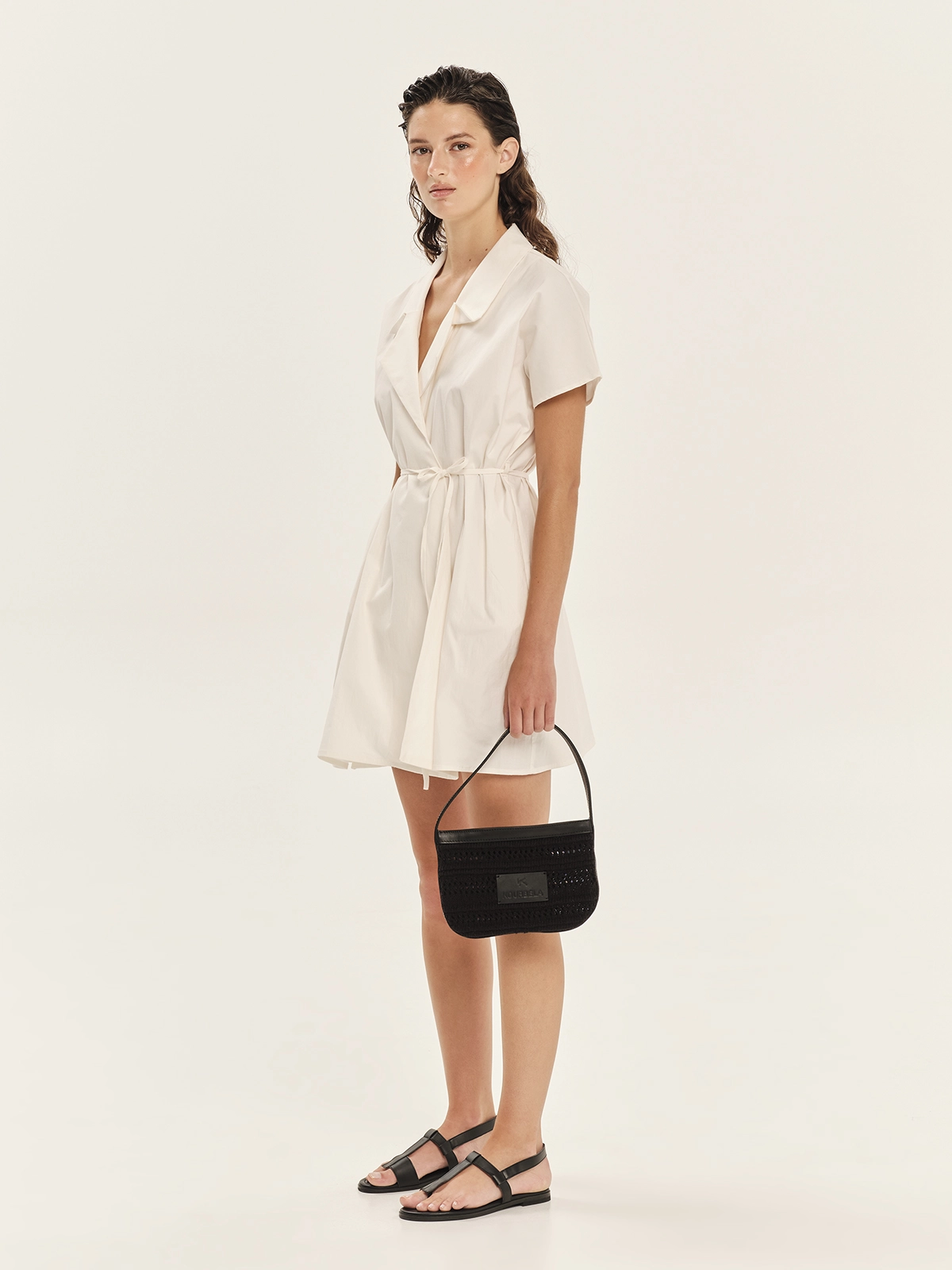 Mini wrap dress crafted from elastic cotton poplin with a crinkle texture, featuring a slim tie at the waist and refined lapels. The fit gently hugs the silhouette, offering both comfort and elegance and has side pockets. A premium mini dress that blends contemporary design with practicality, perfect for daywear and resort looks.