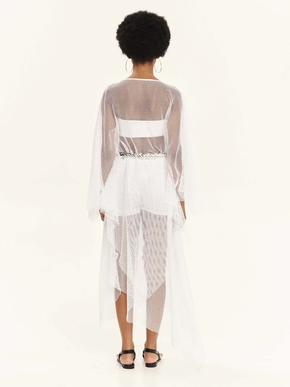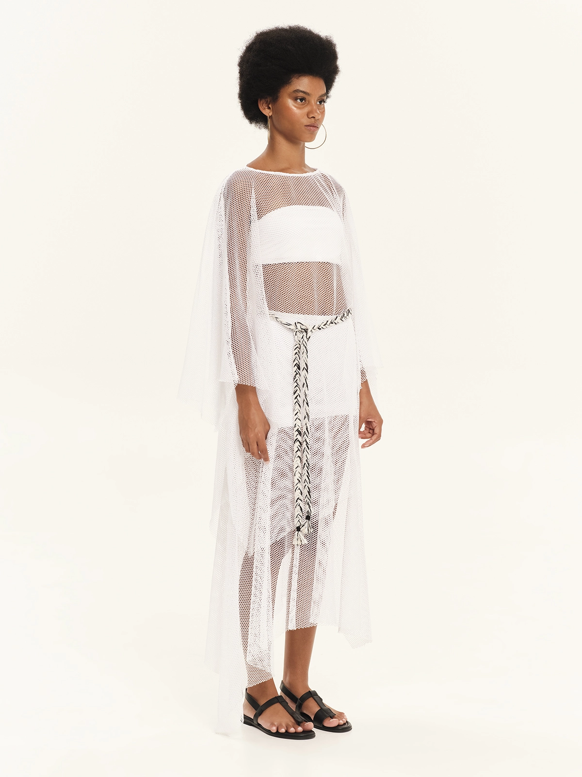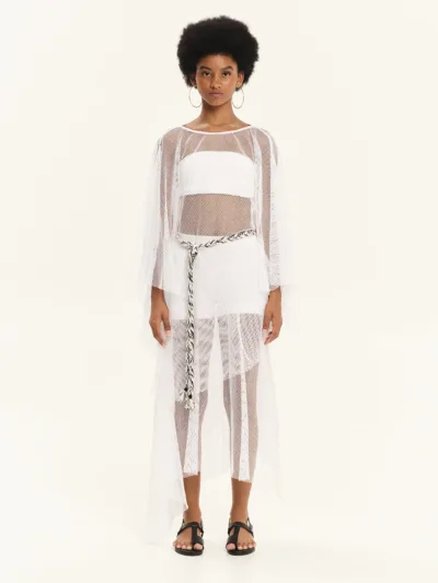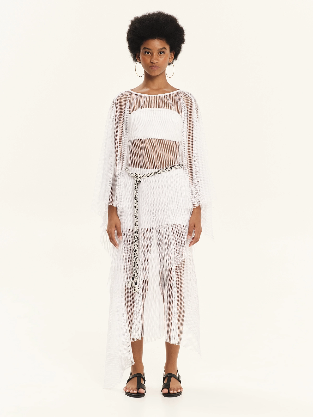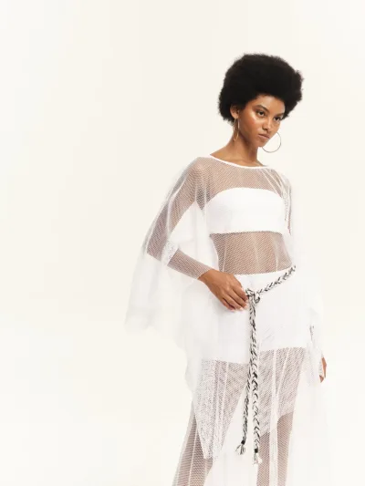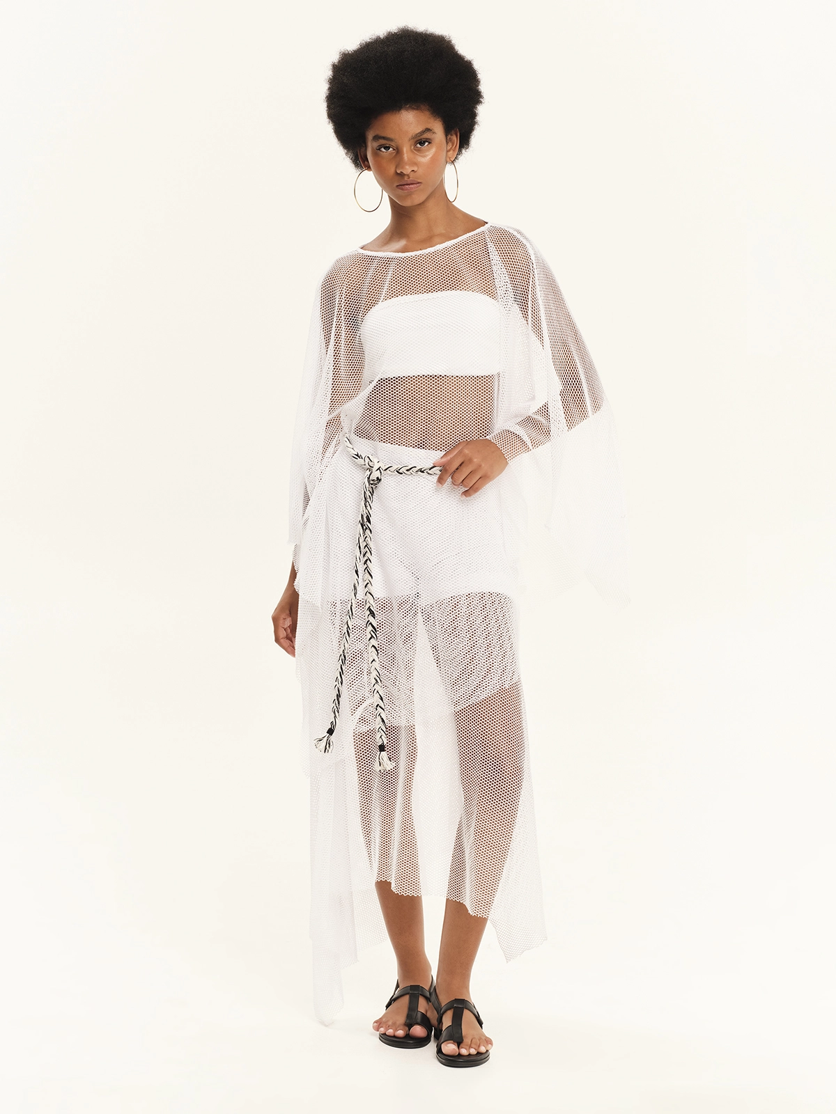 Asymmetrical oversized top made from 100% cotton net. It features a relaxed fit with a boat neckline and belt openings to accentuate the waist. A distinctive resort-inspired piece, perfect for striking, fashion-forward looks.
