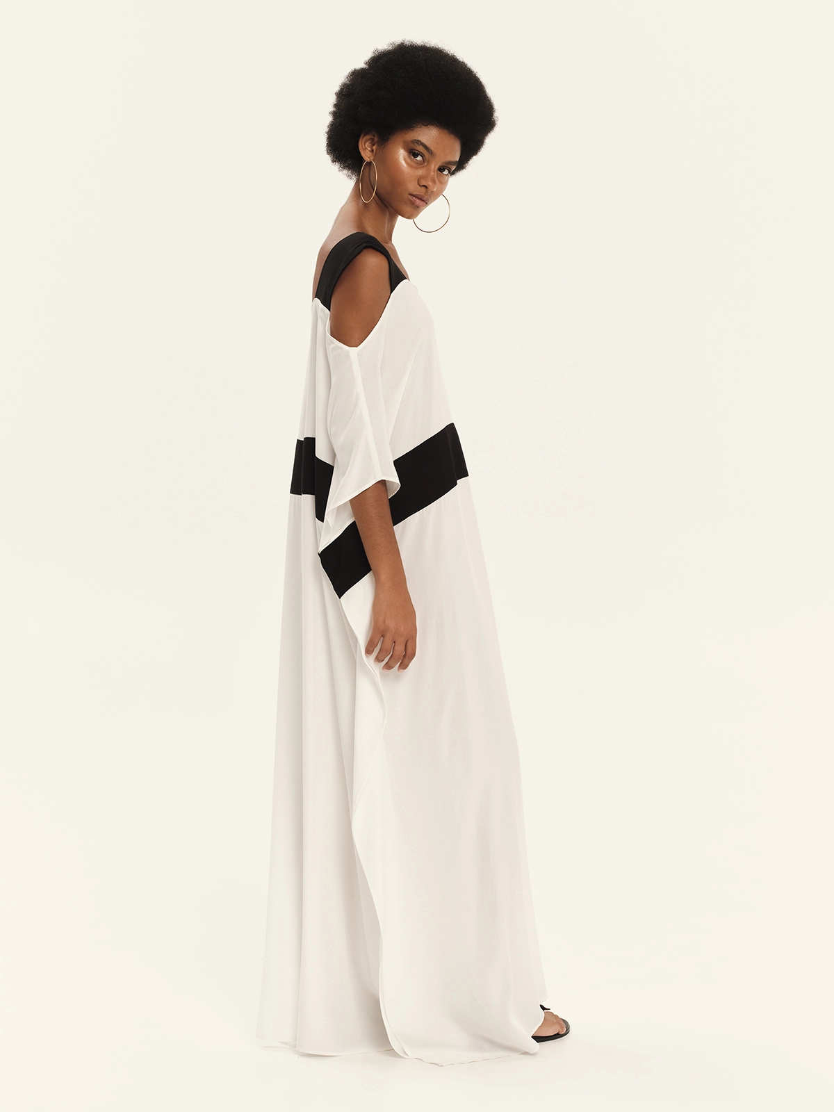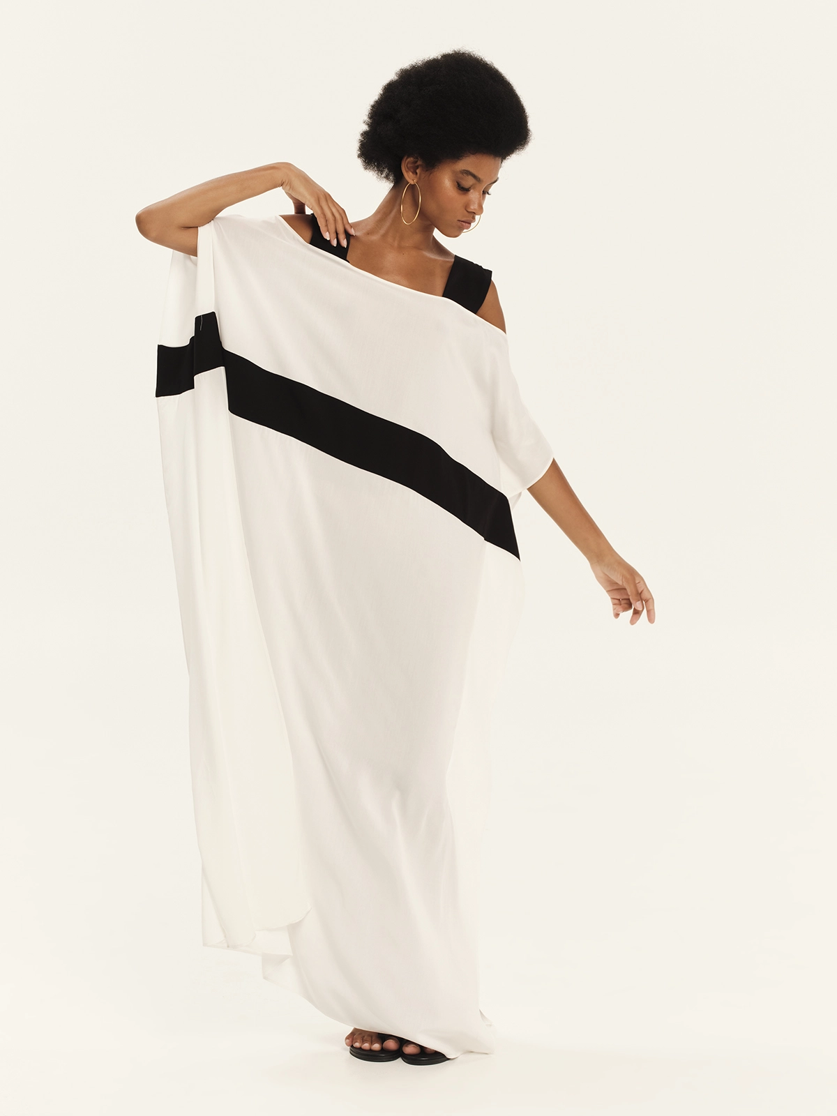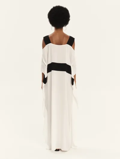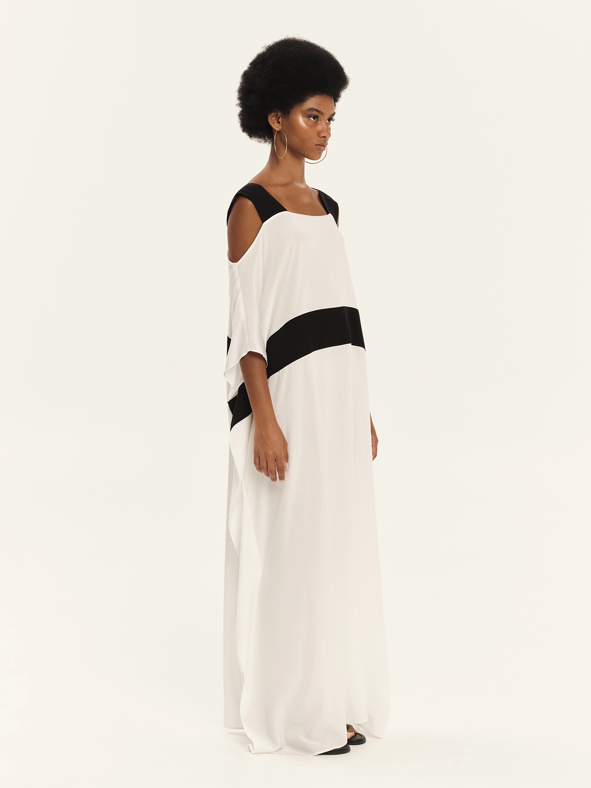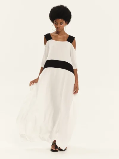 Oversized tunic crafted from 100% viscose, featuring wide shoulder straps as well as cold shoulder design that lend a contemporary feel and a sense of ease. Its relaxed silhouette drapes fluidly over the body, while the contrast waistband subtly defines the figure, creating a balanced interplay of volume and structure. The soft texture and natural movement of the fabric make this tunic an ideal choice for refined, effortless looks with a modern edge.