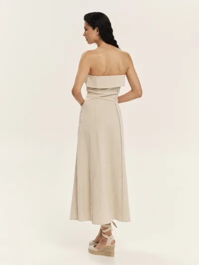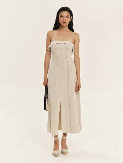 Strapless midi dress crafted from a cotton-linen blend. Designed to hug the silhouette, it features a special elastic band at the top to support the bust. Removable straps provide added security, and it fastens with a zipper closure. External seams and a folded top detail enhance its distinctive yet timeless style, while the gauze-like texture of the fabric adds a unique summer touch with a resort-inspired feel.