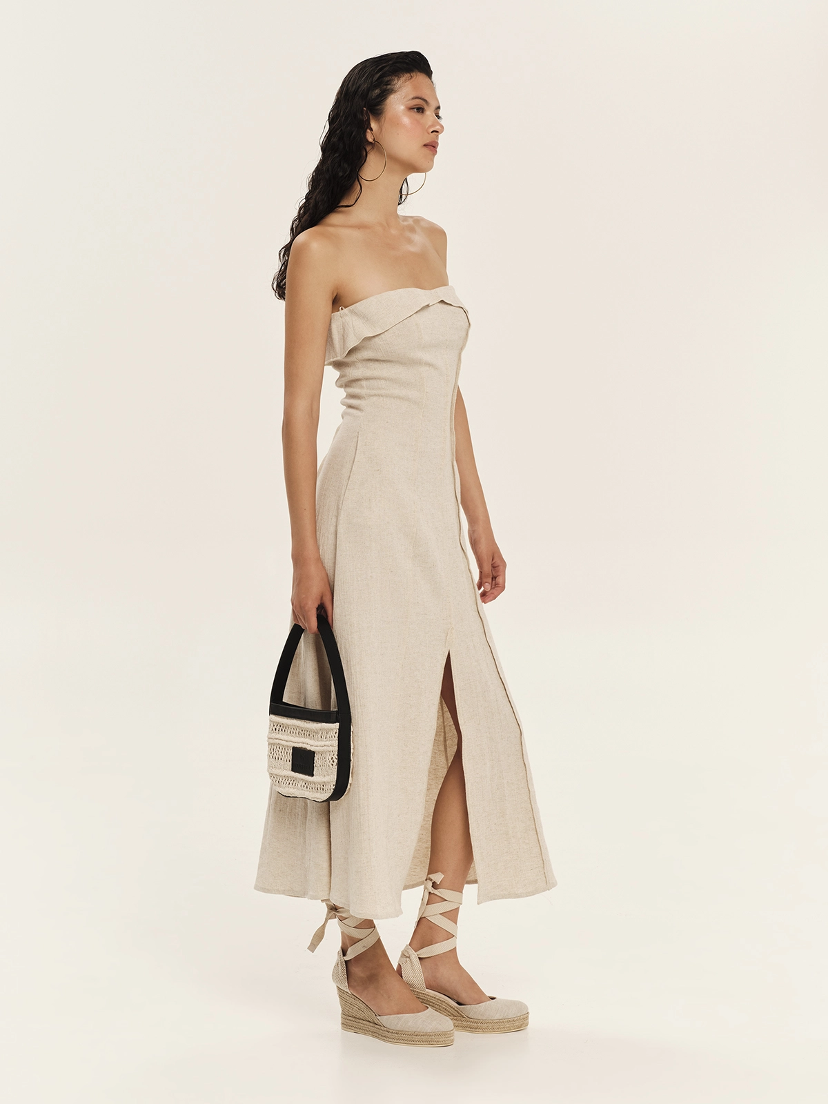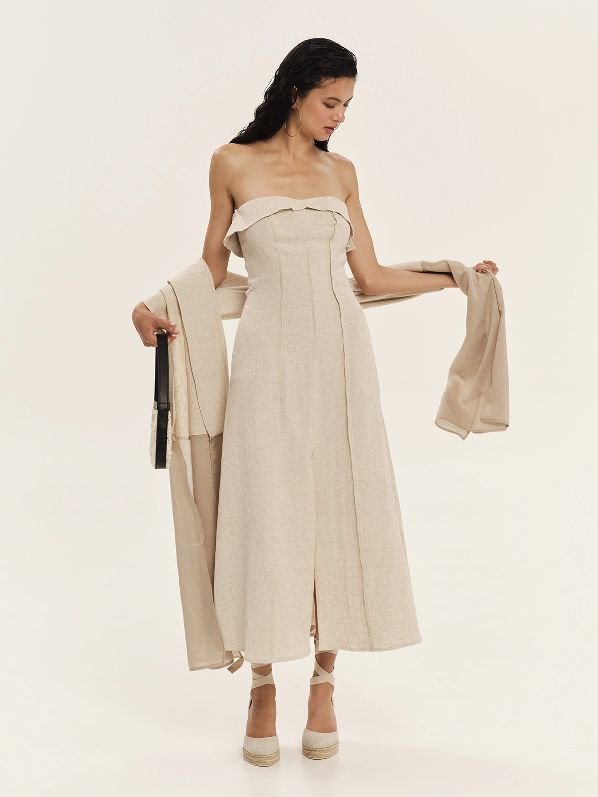 Strapless midi dress crafted from a cotton-linen blend. Designed to hug the silhouette, it features a special elastic band at the top to support the bust. Removable straps provide added security, and it fastens with a zipper closure. External seams and a folded top detail enhance its distinctive yet timeless style, while the gauze-like texture of the fabric adds a unique summer touch with a resort-inspired feel.