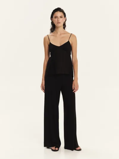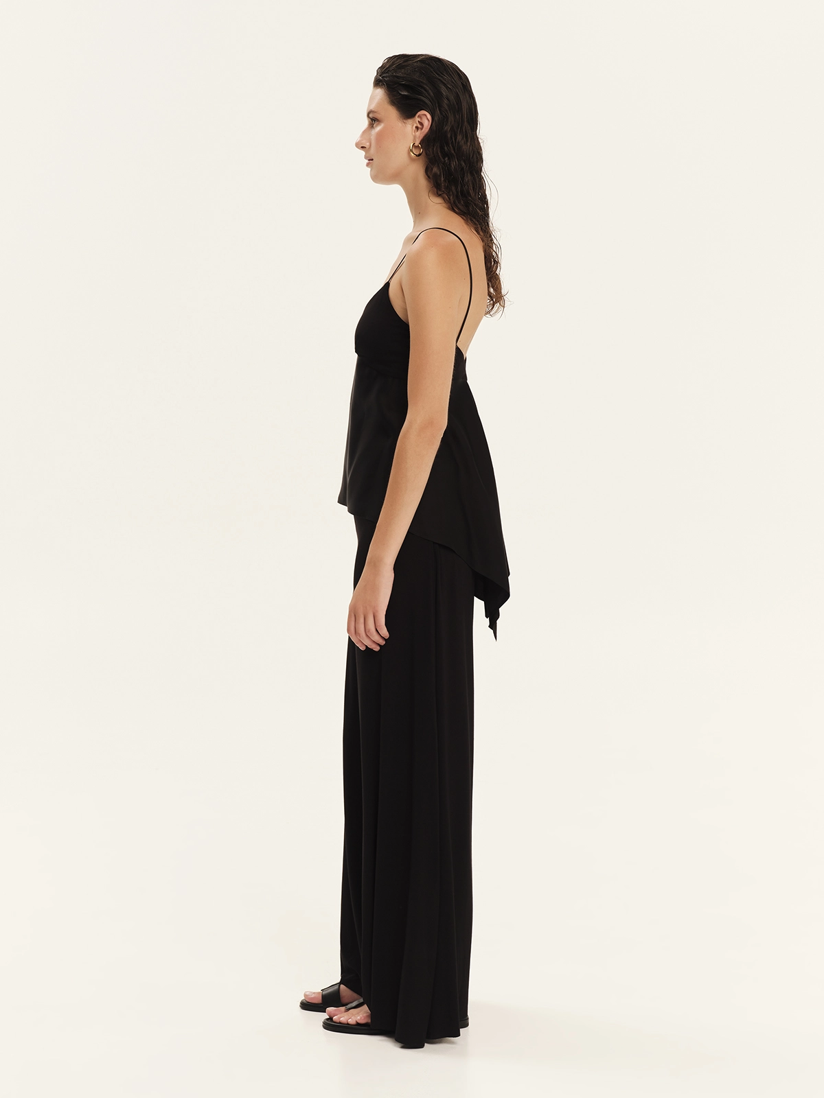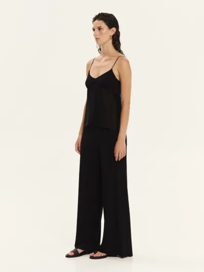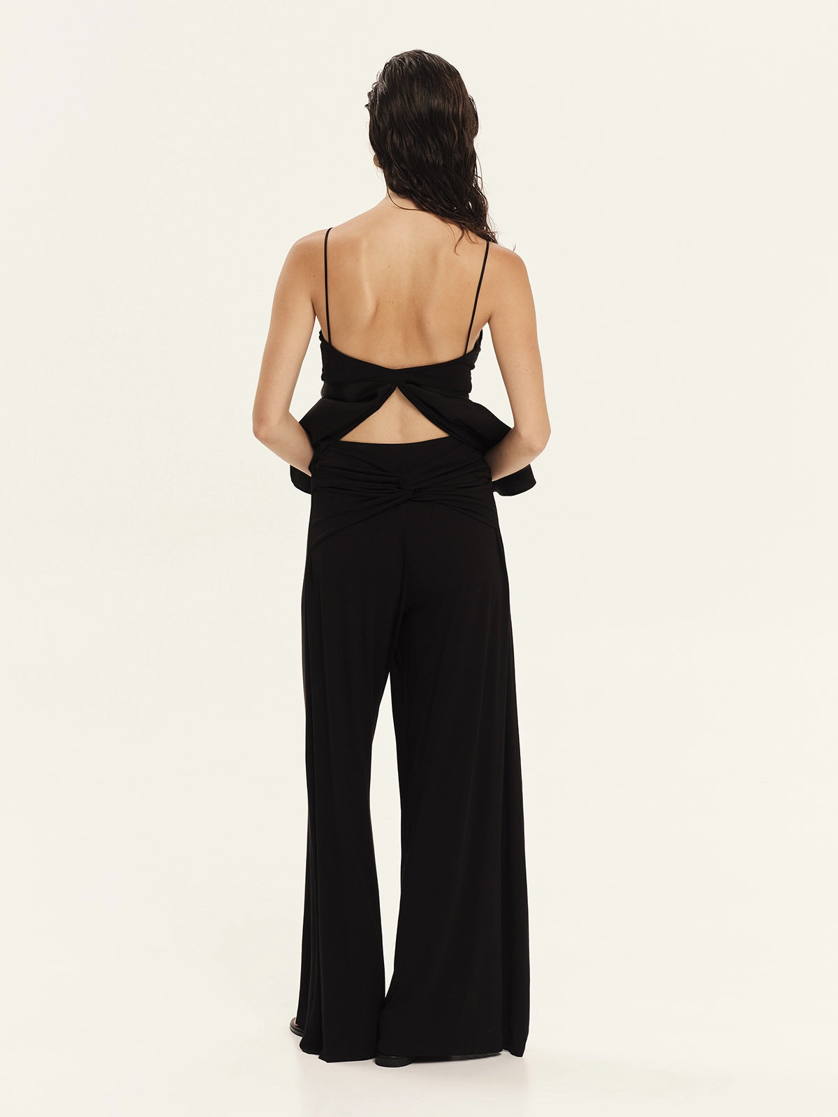 Top featuring a V neckline that combines silky viscose at the bust with bamboo jersey at the lower part, creating a balanced contrast of textures. The front highlights the decolletage with clean lines, while the back panel with an opening adds movement and a contemporary edge to the design. A refined top with modern character, suitable for everyday wear as well as elevated looks.